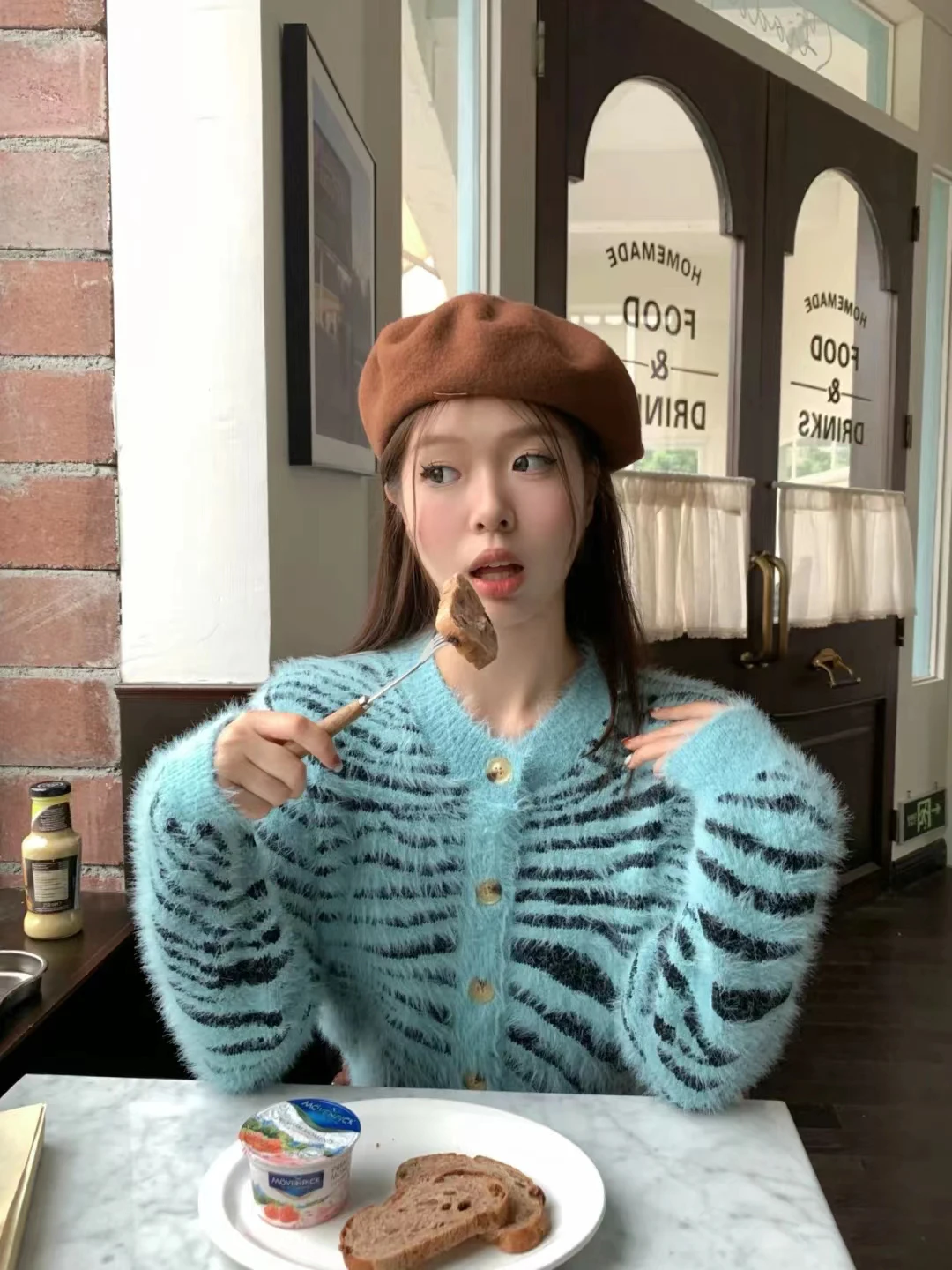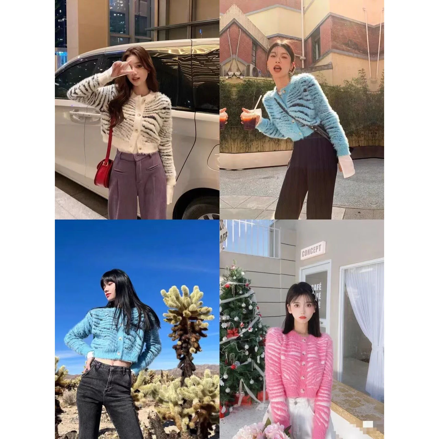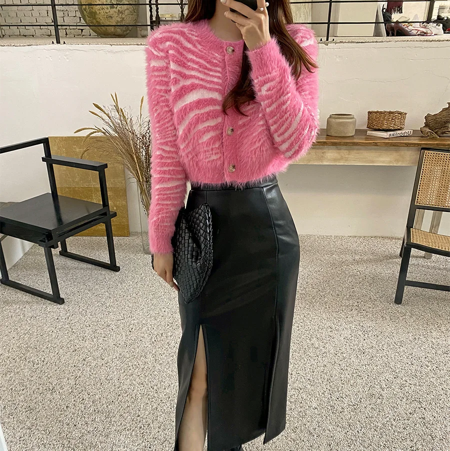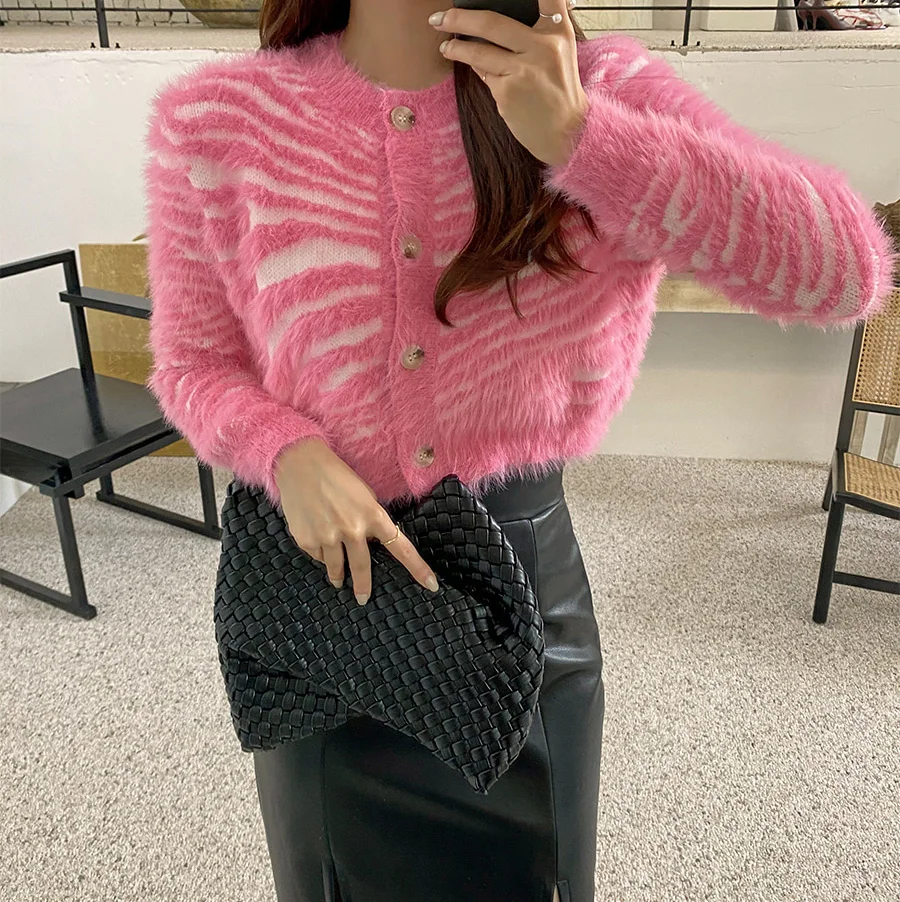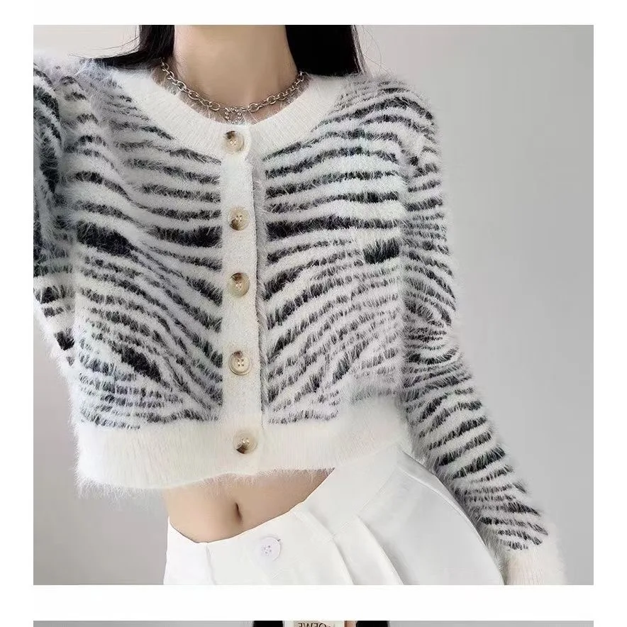 Zebra-stripe Cardigan Women Loose Hotsweet High Street American Punk Style Fluffy Cropped Midriff-baring O-neck Temperament Ins
