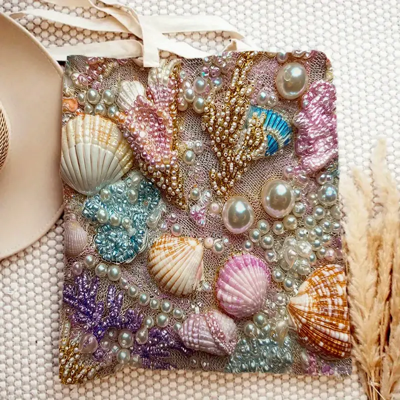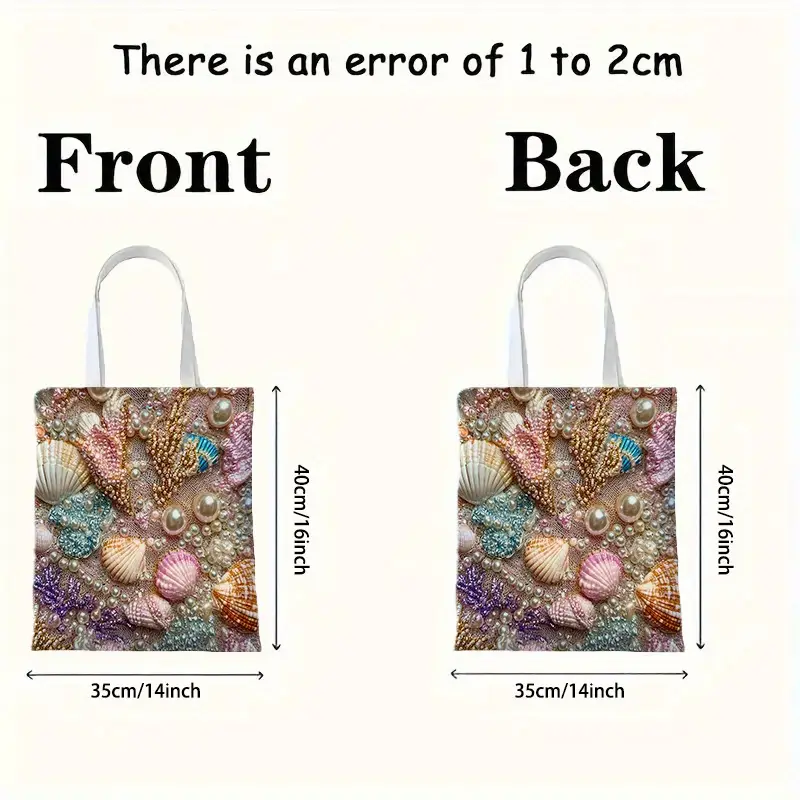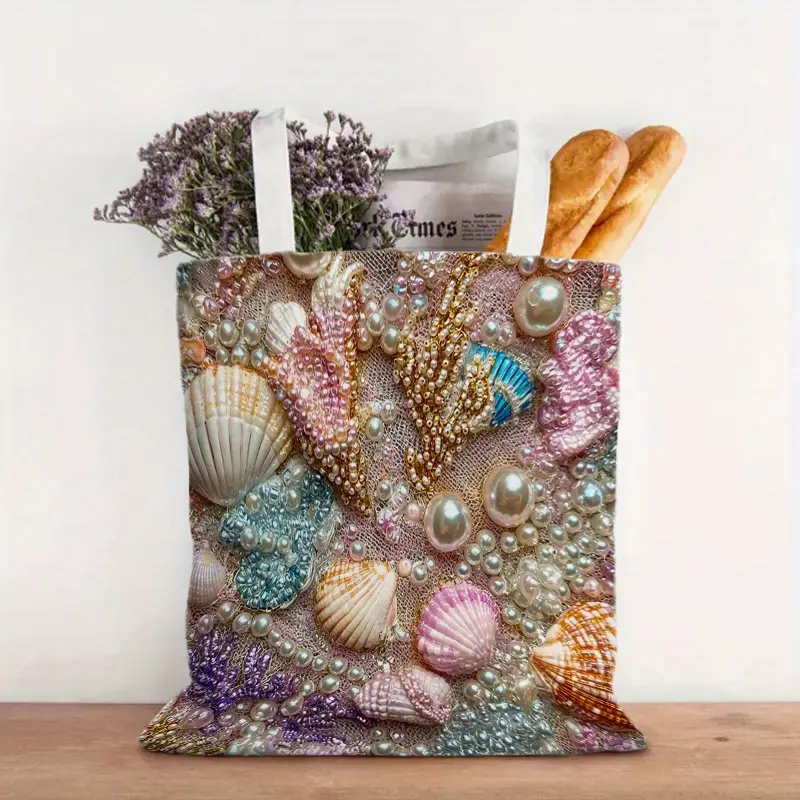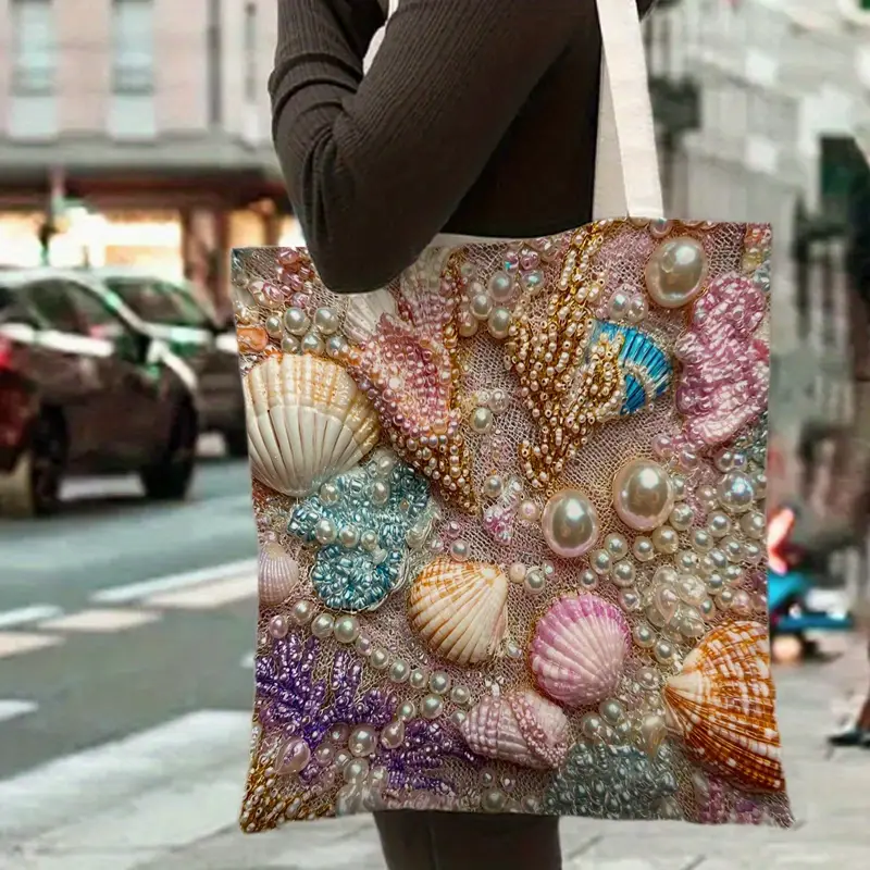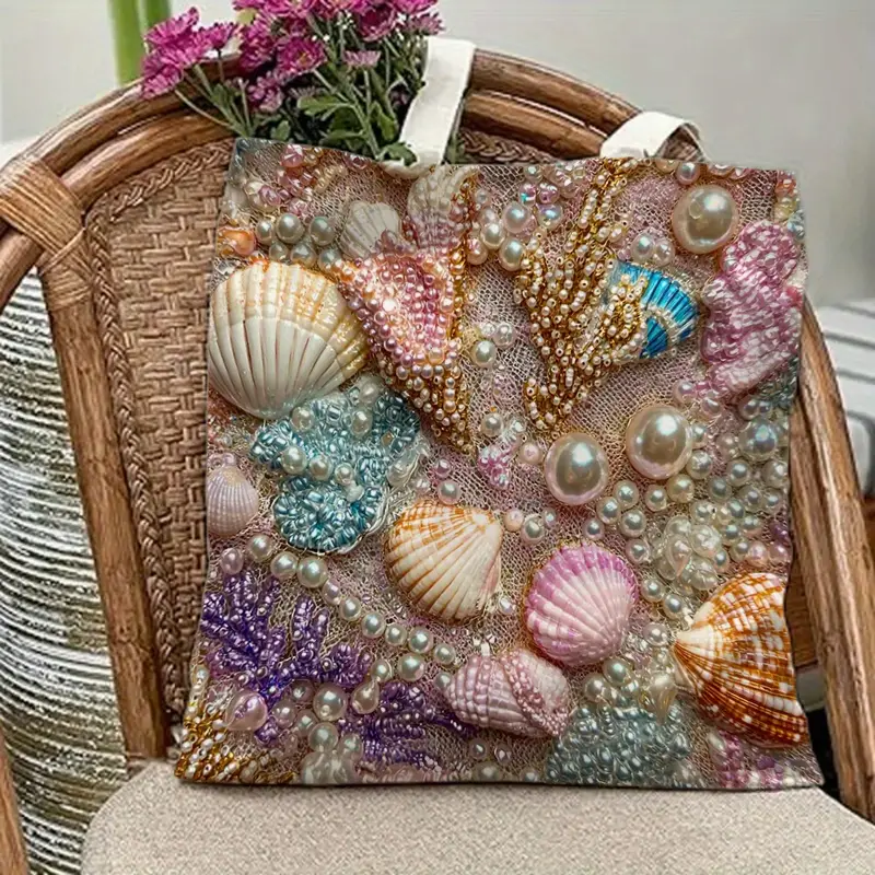 1pc Elegant Beaded Fabric Tote Bag with Pearls and Shells - 14x16in, Reusable Shoulder Bag for Travel, Beach, School, and Shopping, Beach Bag
