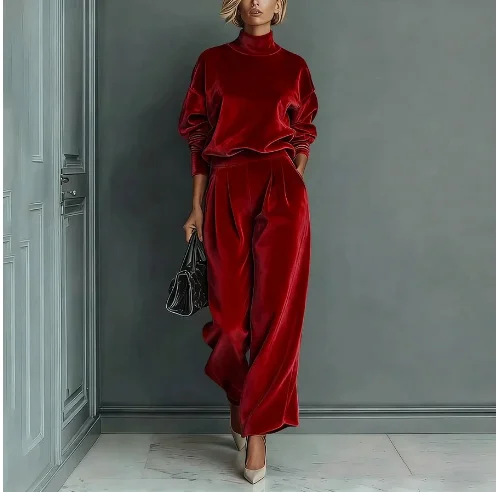 2026 Autumn/Winter New Style Women Fashion Casual Warm Sportswear Set Velvet Long-sleeved Solid Color High-neck Wide-leg Pants
