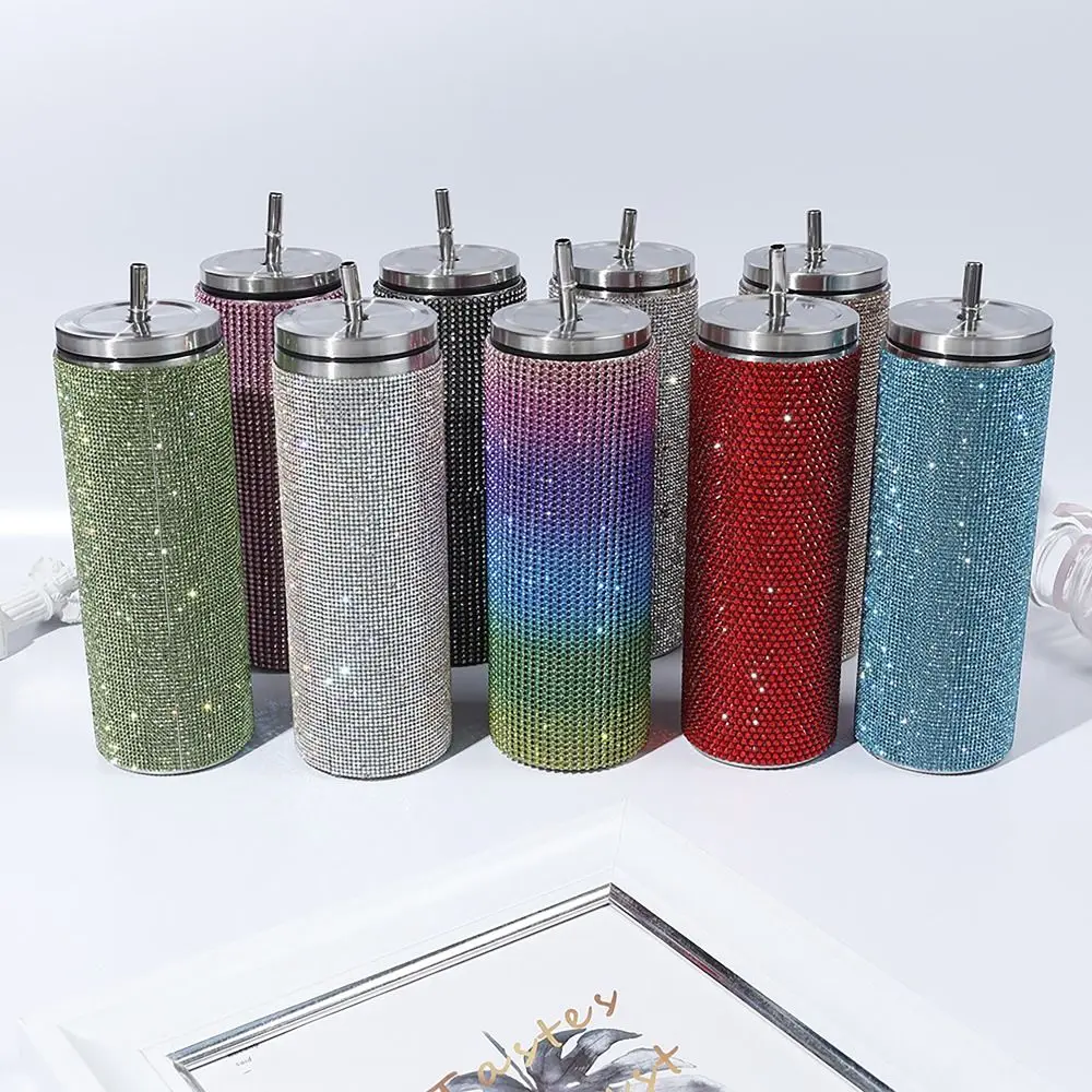 20oz Thermal Bottle Portable 304 Stainless Steel with Straw Coffee Cup Stick-on Crystals Vacuum Cup Winter