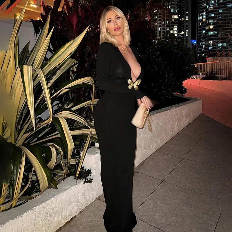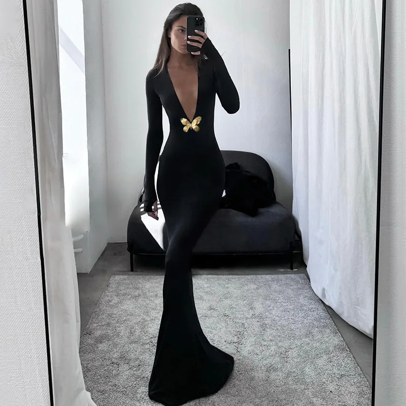 🌟 What is it - Elevate your style with our Chic Deep V Neck Maxi Dress, a stunning silhouette crafted for comfort and elegance. Perfect for club outings or autumn gatherings, this stylish gown features exclusive cryptographic embellishments and long sleeves that blend allure with sophistication.