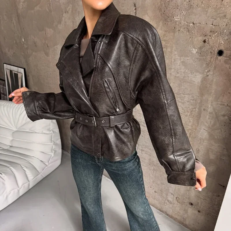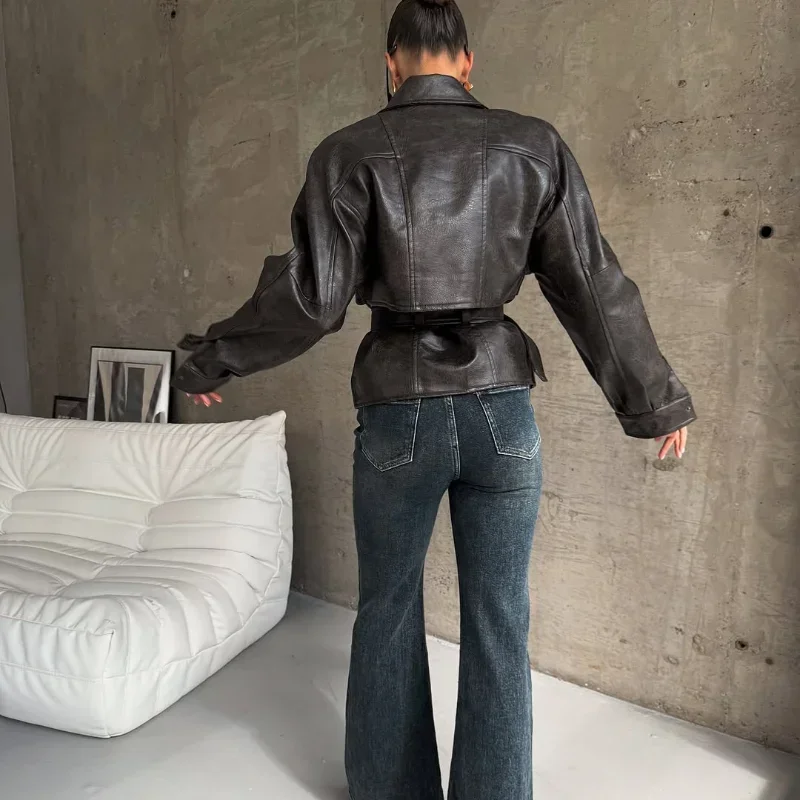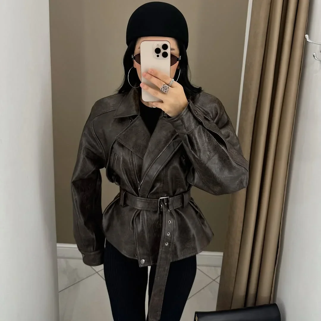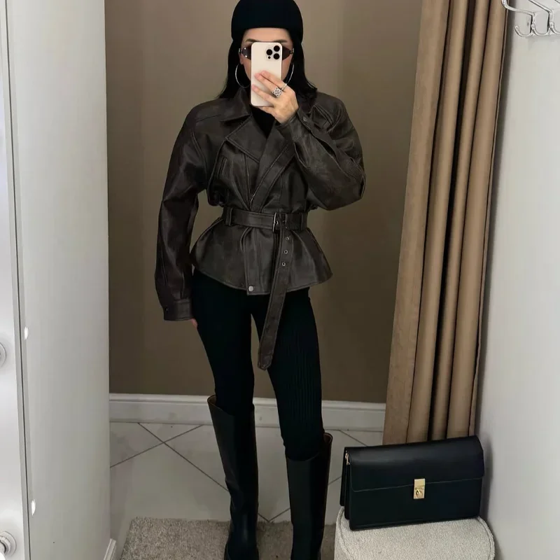 🍂 What is it - Elevate your autumn wardrobe with our Chic Leather Short Jacket, featuring a trendy lapel collar, belted design, and functional zipper pockets. This stylish outerwear is perfect for everyday wear and complements any outfit effortlessly.