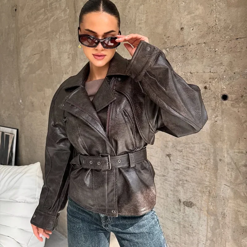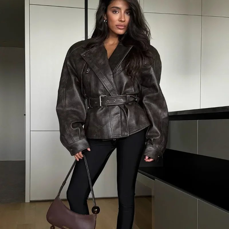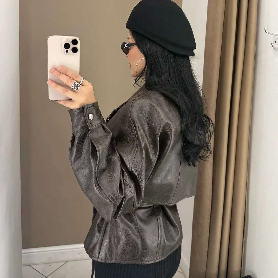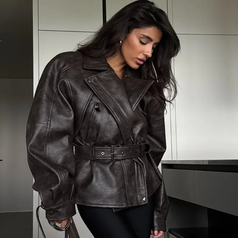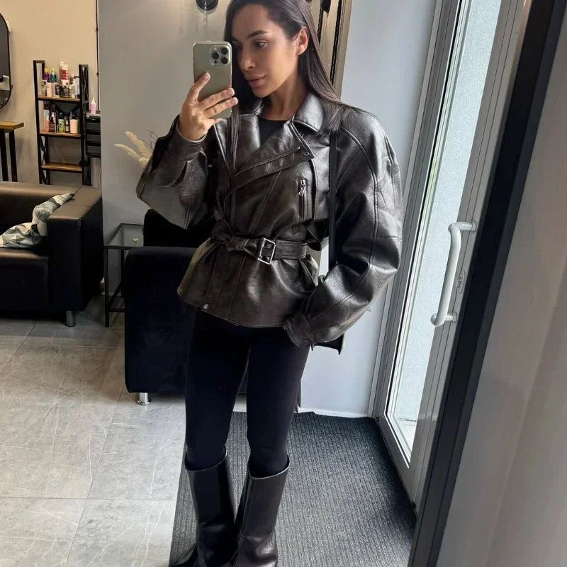 🍂 What is it - Elevate your autumn wardrobe with our Chic Leather Short Jacket, featuring a trendy lapel collar, belted design, and functional zipper pockets. This stylish outerwear is perfect for everyday wear and complements any outfit effortlessly.