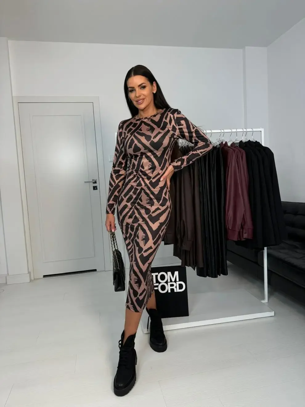 Cross-Border Independent Station Women's Spring Autumn New Print Slimming Base Layer Dress round Neck Full Sleeve Ankle-Length