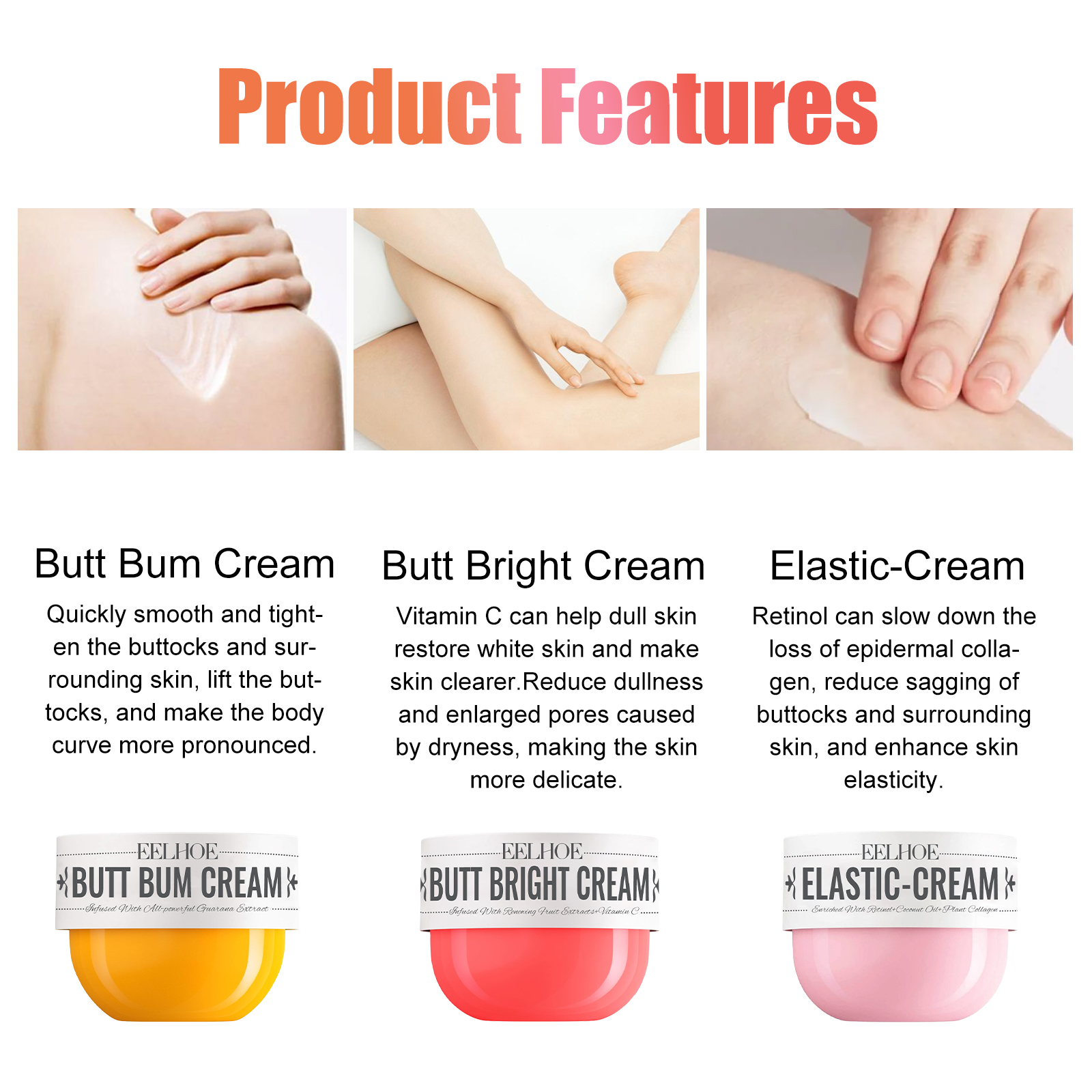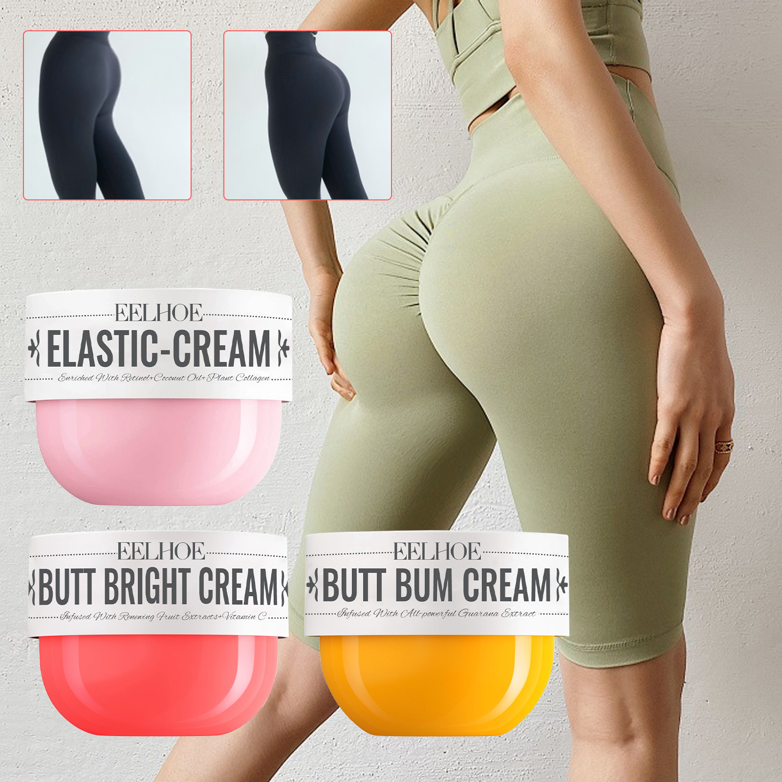 ✨ What is it - Unleash your curves with EELHOE Butt Bum Cream, a premium formula blended with Guarana extract, soybean extract, and cupuacu oil. Specially designed to smooth and tighten your buttocks and surrounding skin, it enhances your body's natural beauty while keeping your skin supple and hydrated.