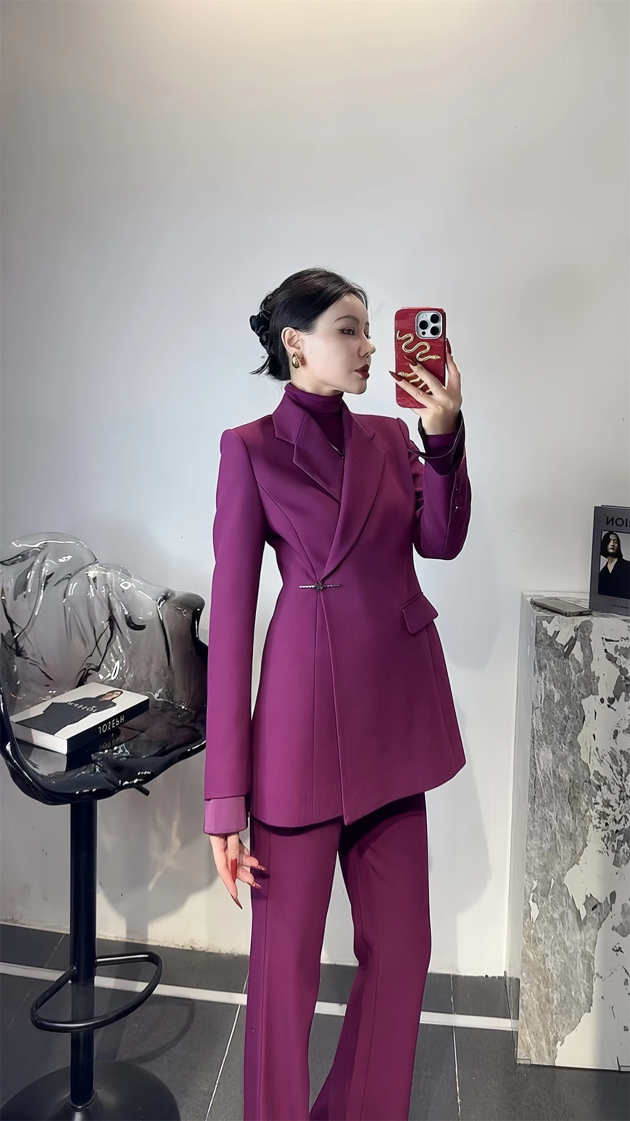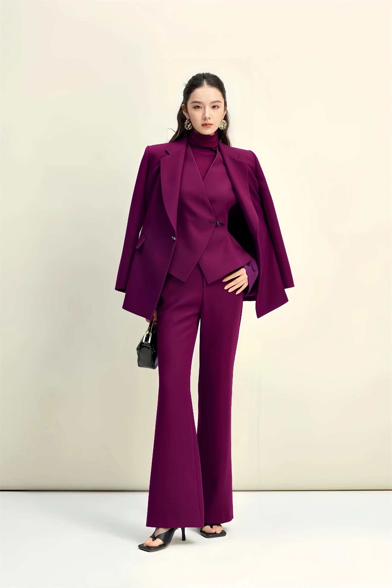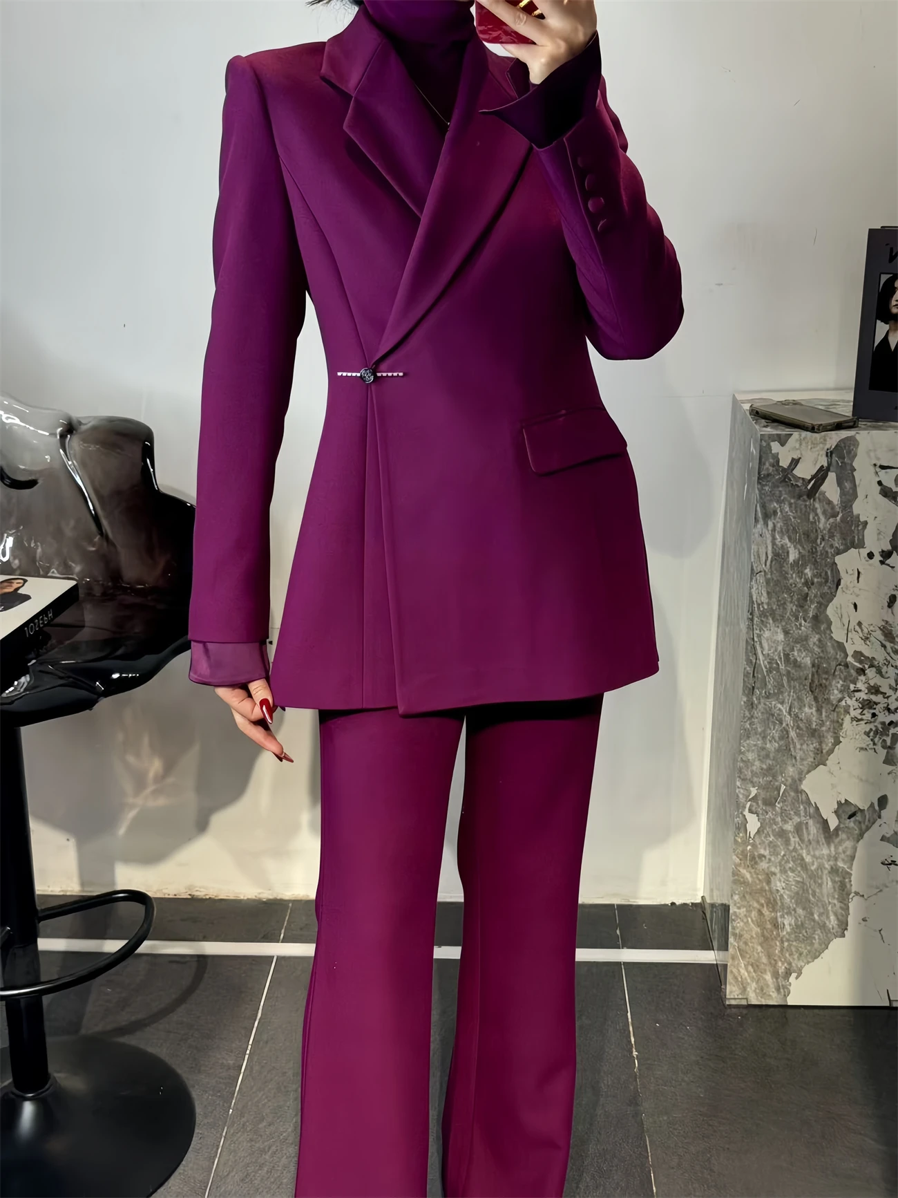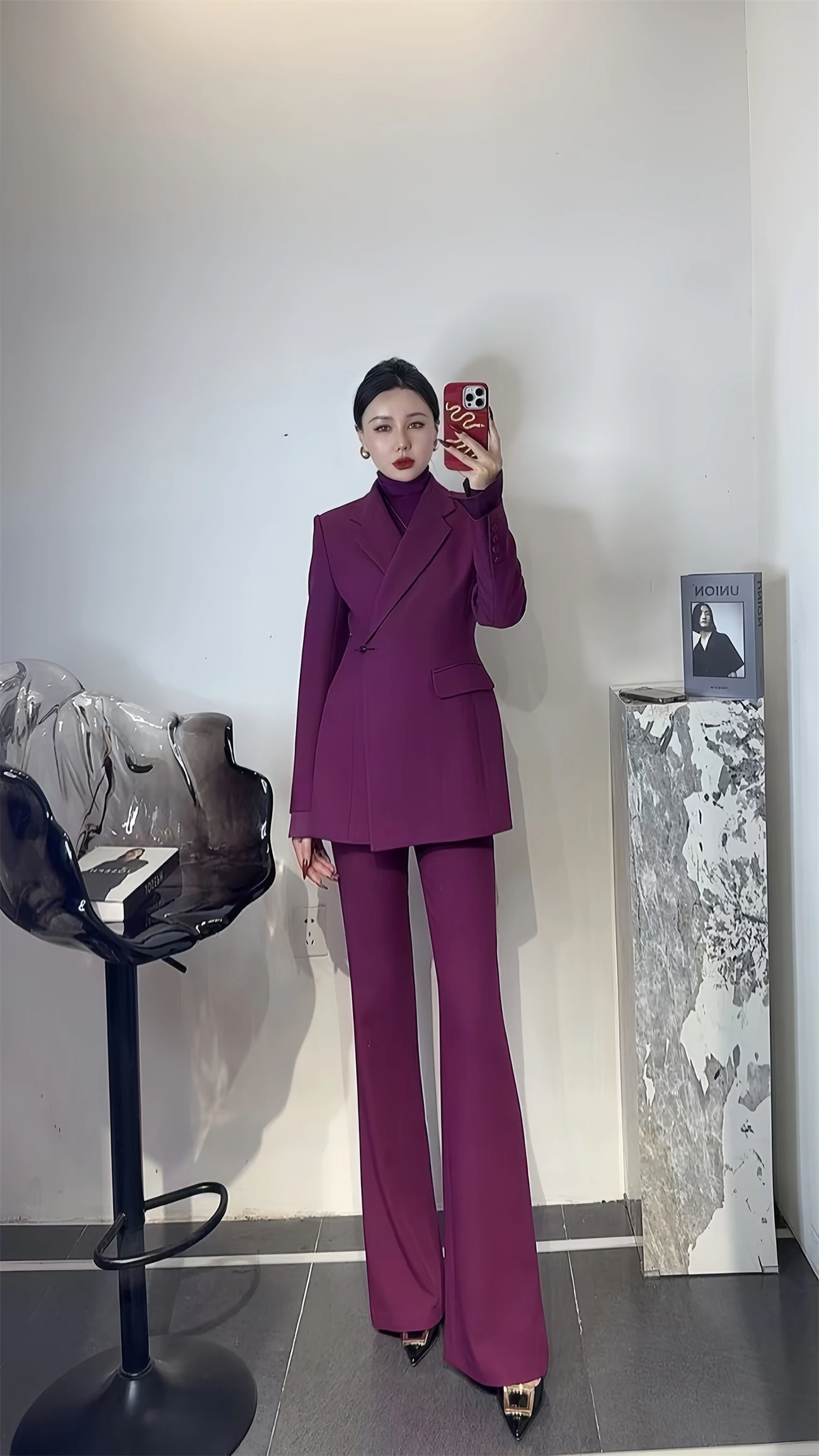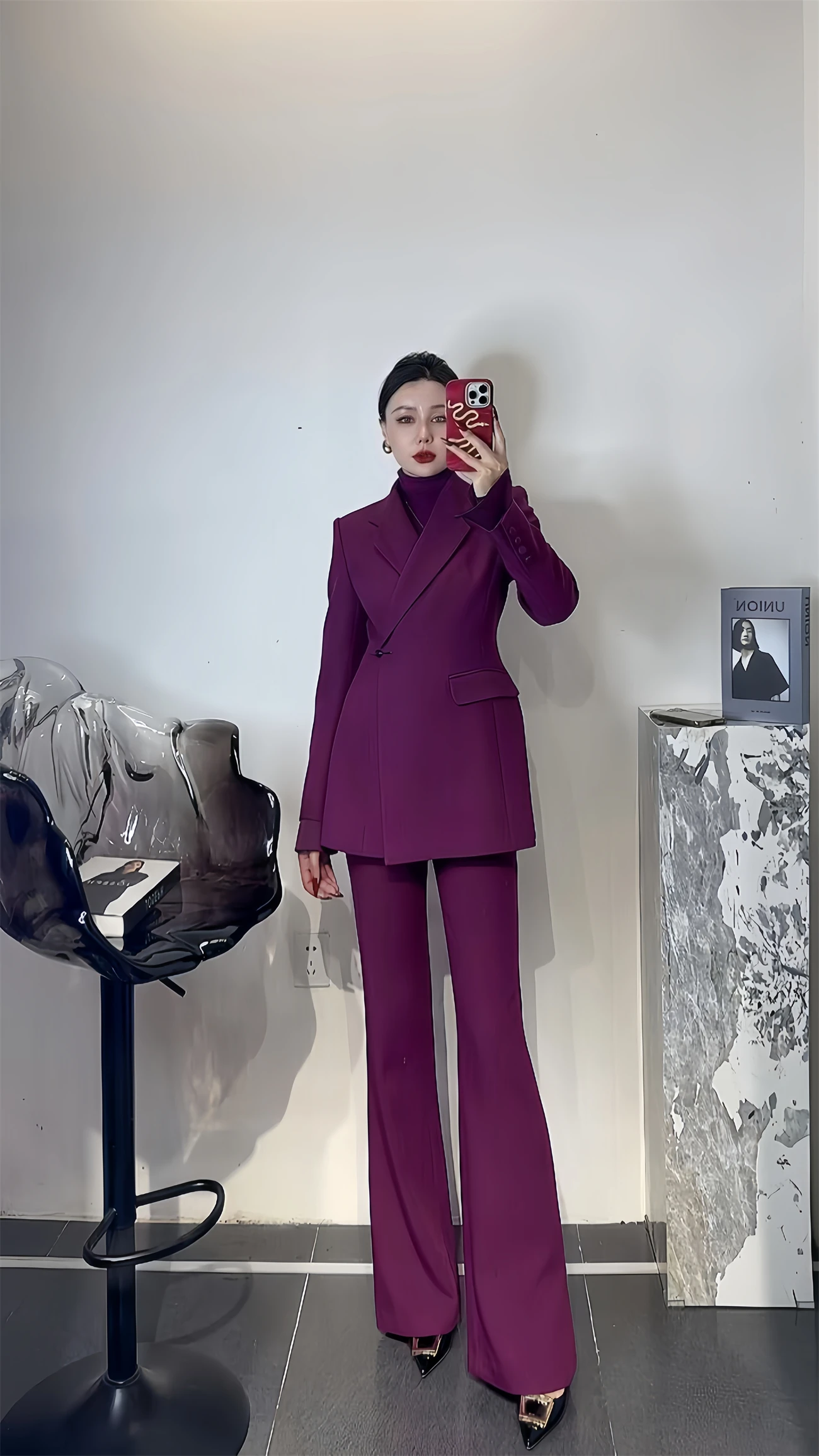 Ele Women's Slim Fit Suit Two-Piece Set Autumn Winter Purple Flared Pants Chinese Sle Faionable Casual Workwear