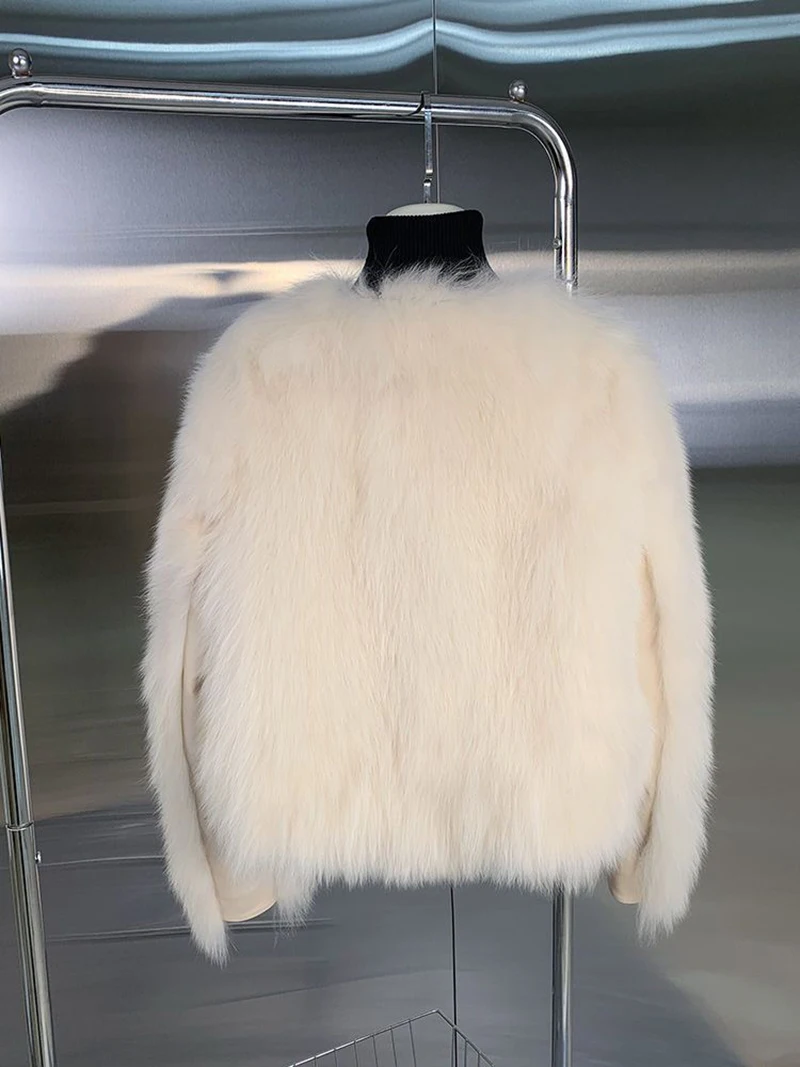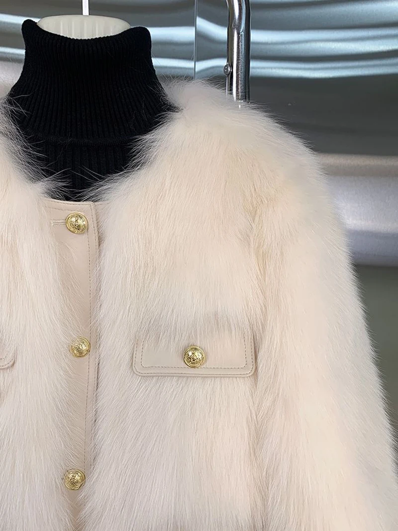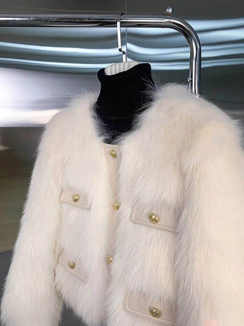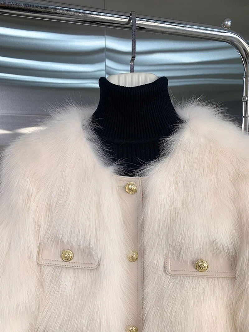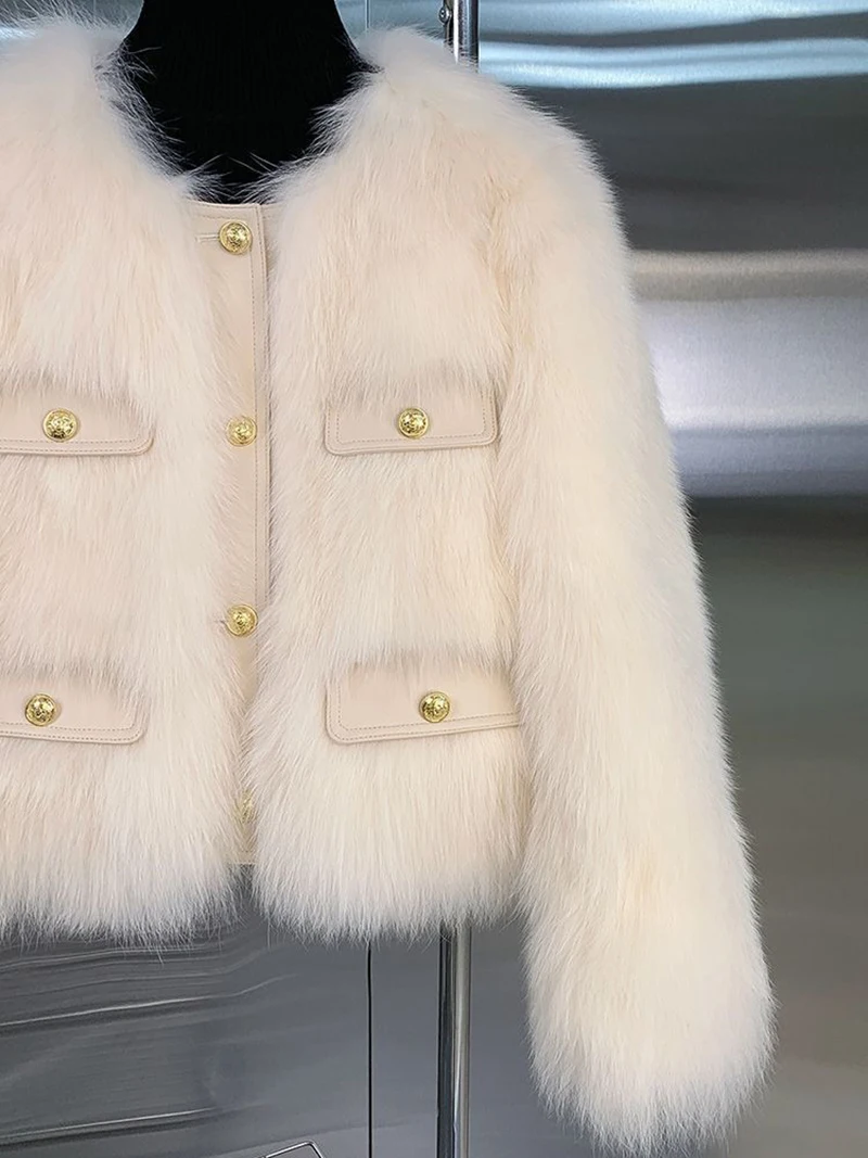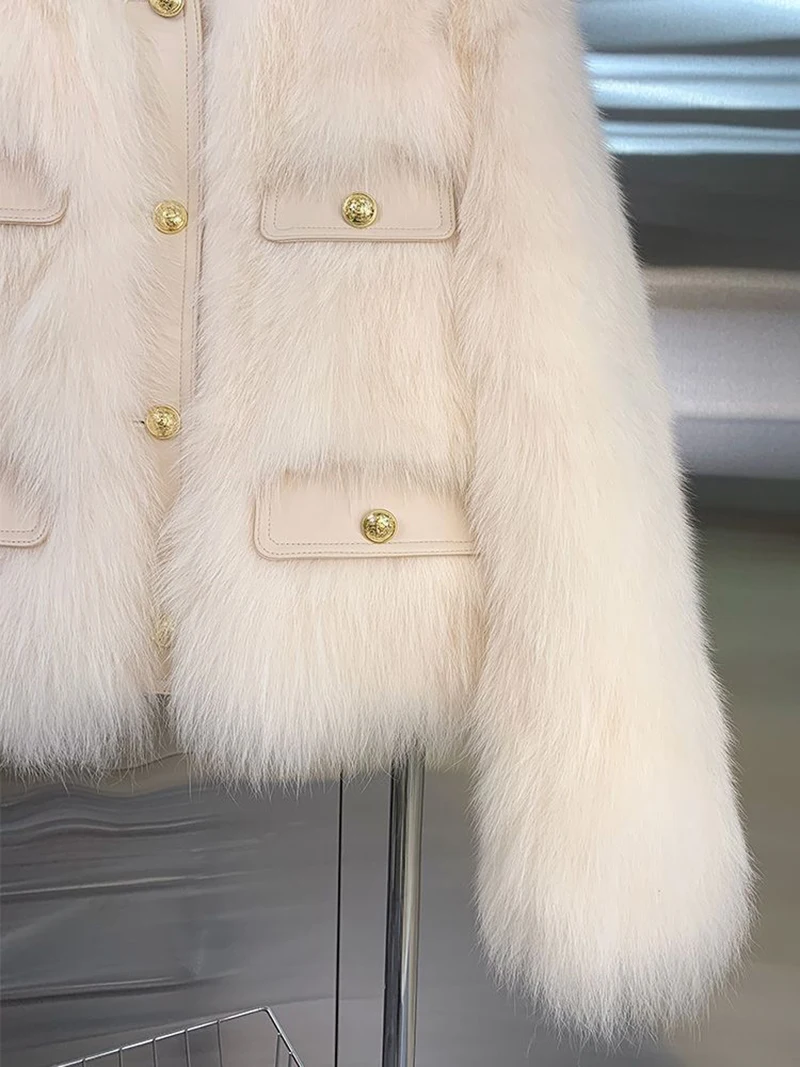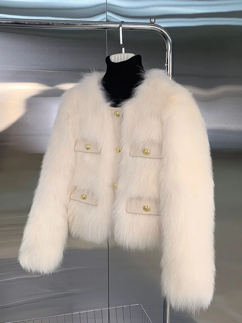 Elegant Faux Fur Jacket Women Fall Winter Warm Thick O-Neck Button Solid Outwear Fashion High Street Imitation Fox Fur Lady Coat