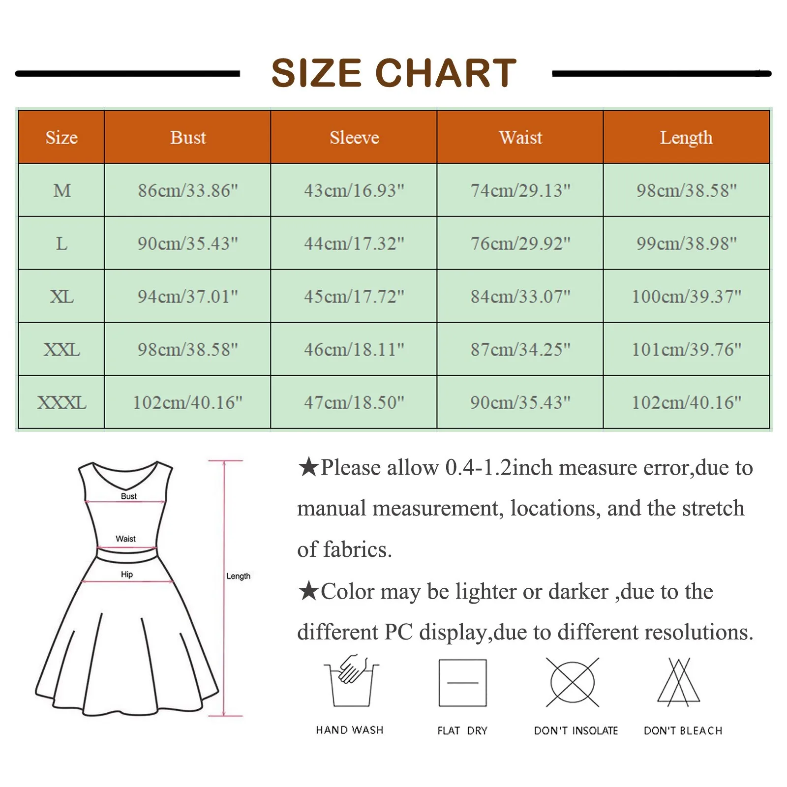 | Size | Bust | Sleeve | Waist | Length |