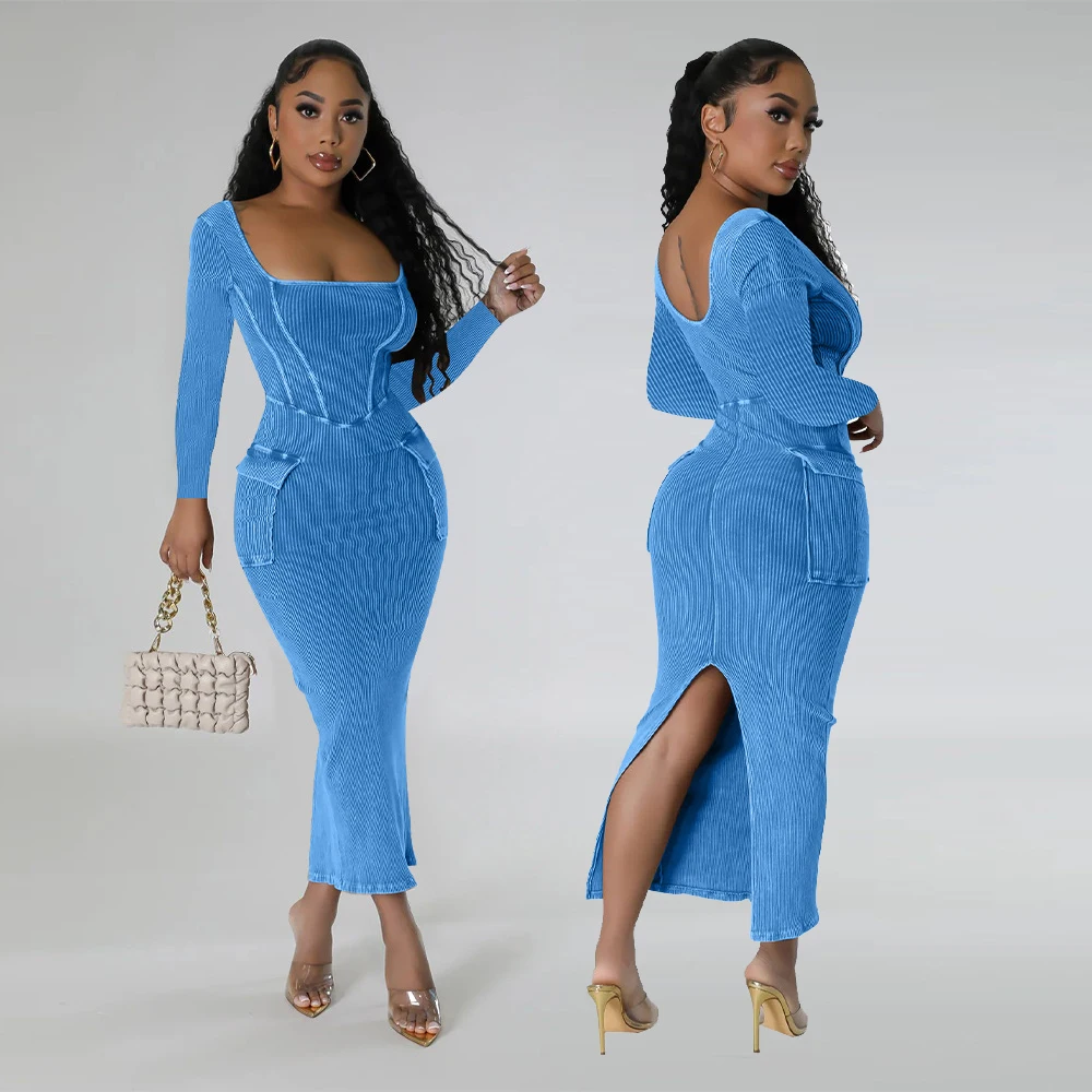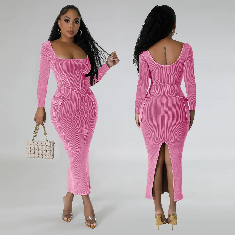 Elegant Sexy Ribbed Dress Casual Bodycon Evening Dress Women 2023 Fall Winter Clothes Club Party Long Maxi Cargo Pocket Dresses
