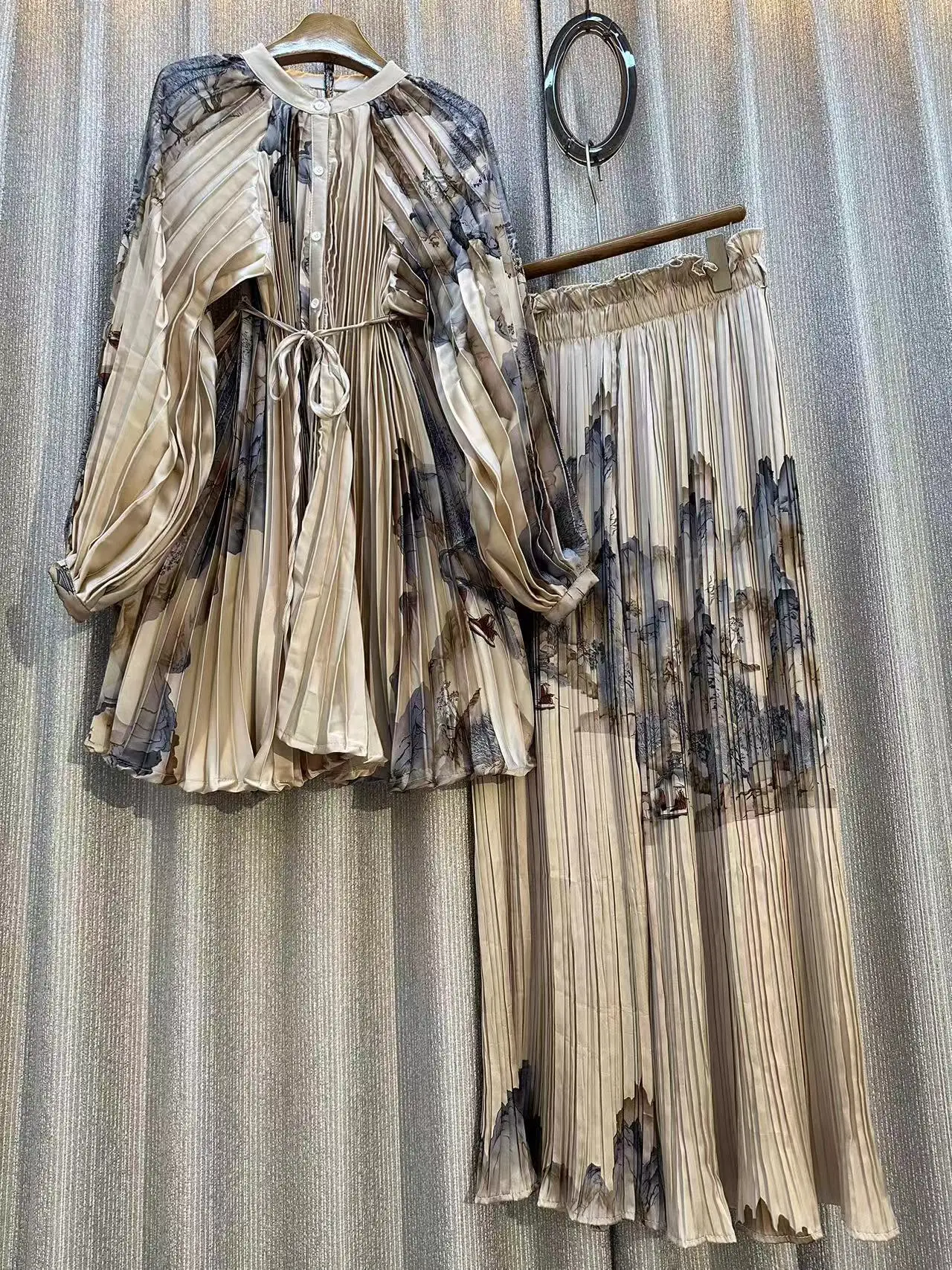 Fashion Print Chic Spring Sets For Women Two-piece Loose Shirt High Waist Pleated Wide Leg Pants Casual Home Suit Female 2023