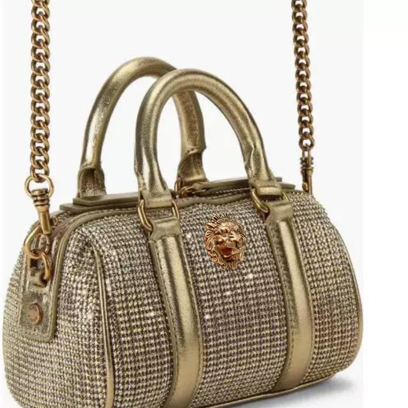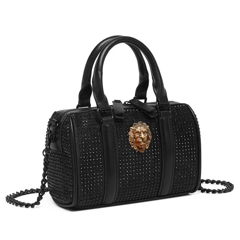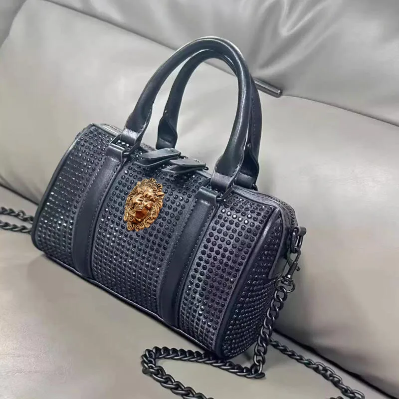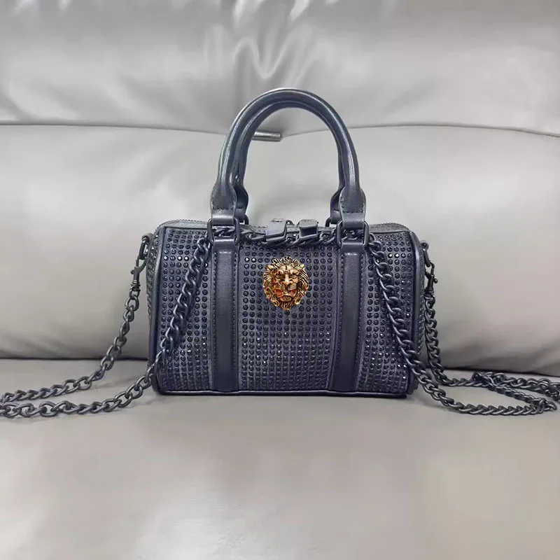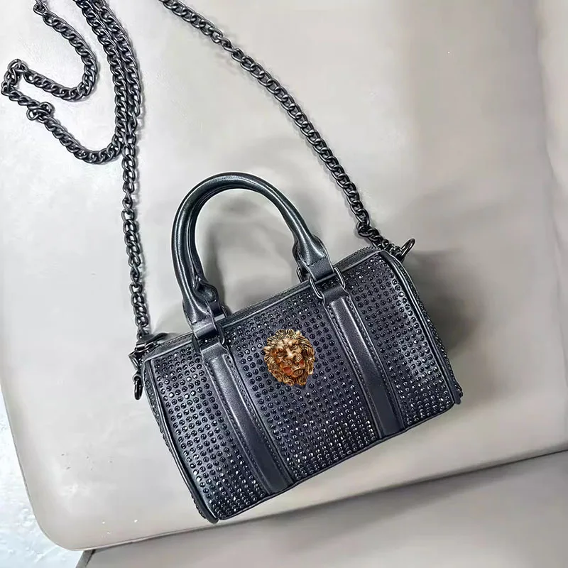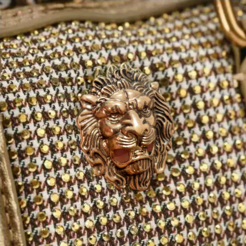 Golden leather handbag with chain strap, single shoulder crossbody bag with lion head design, high-end small square bag 42