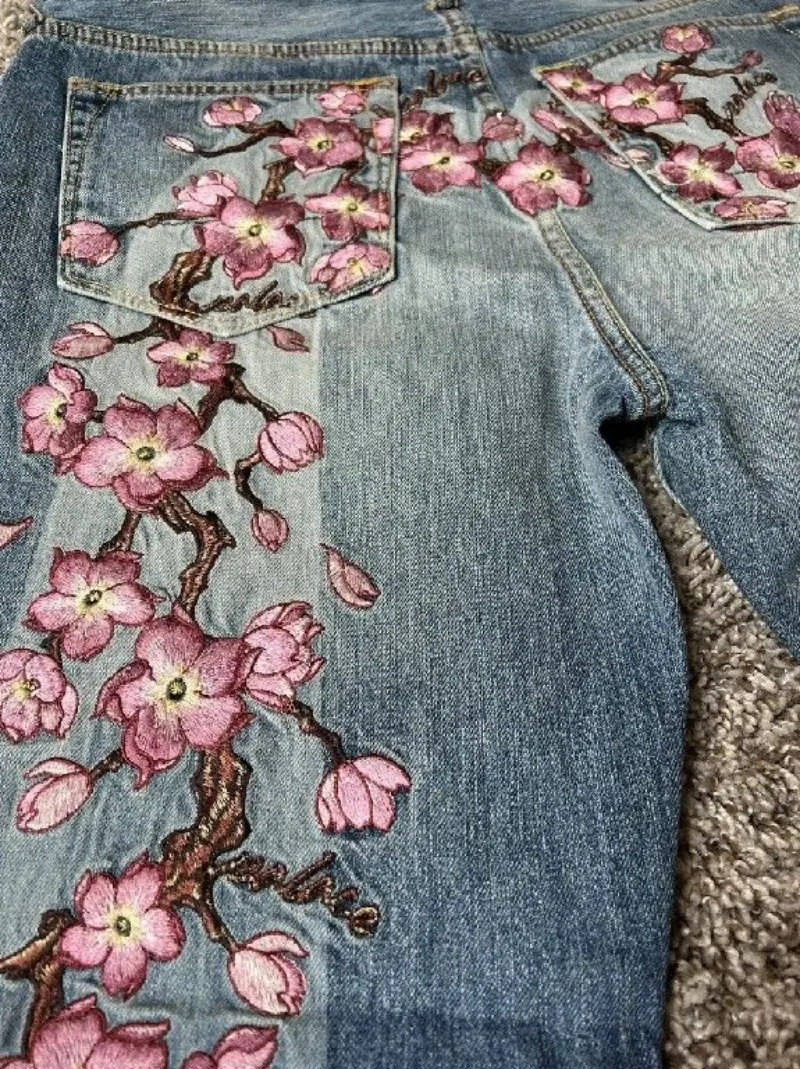 Harajuku pants men cherry blossom Embroidery Hip Hop y2k streetwear jeans men women Retro fashion Casual wide leg Denim Pants