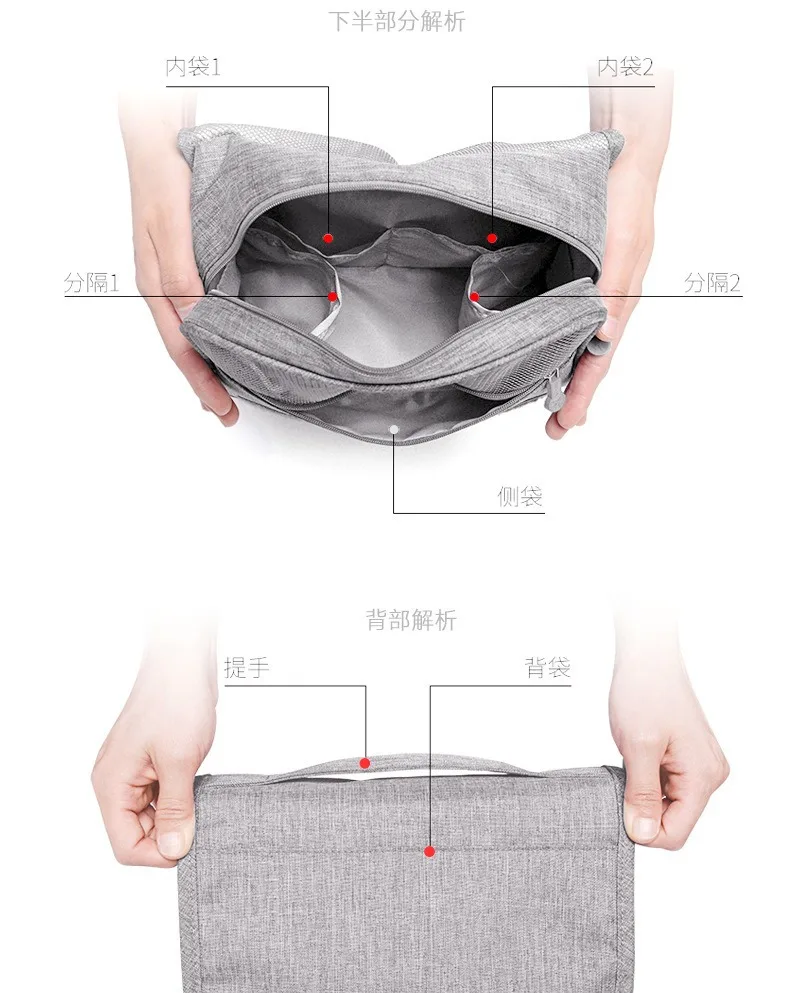1. Unzip the bag to reveal the thoughtfully designed compartments.