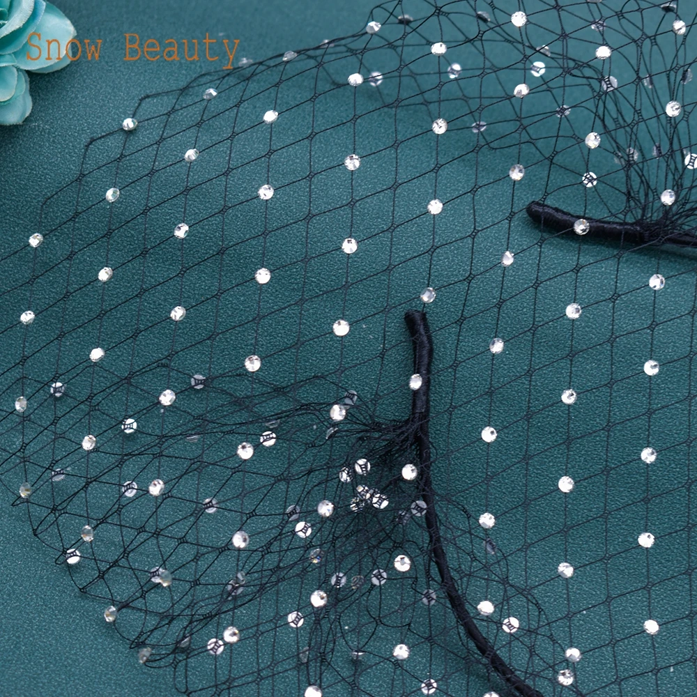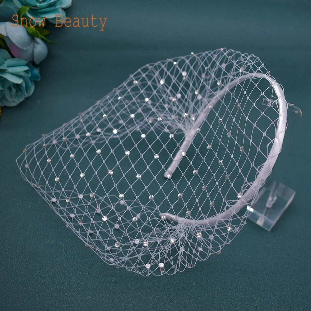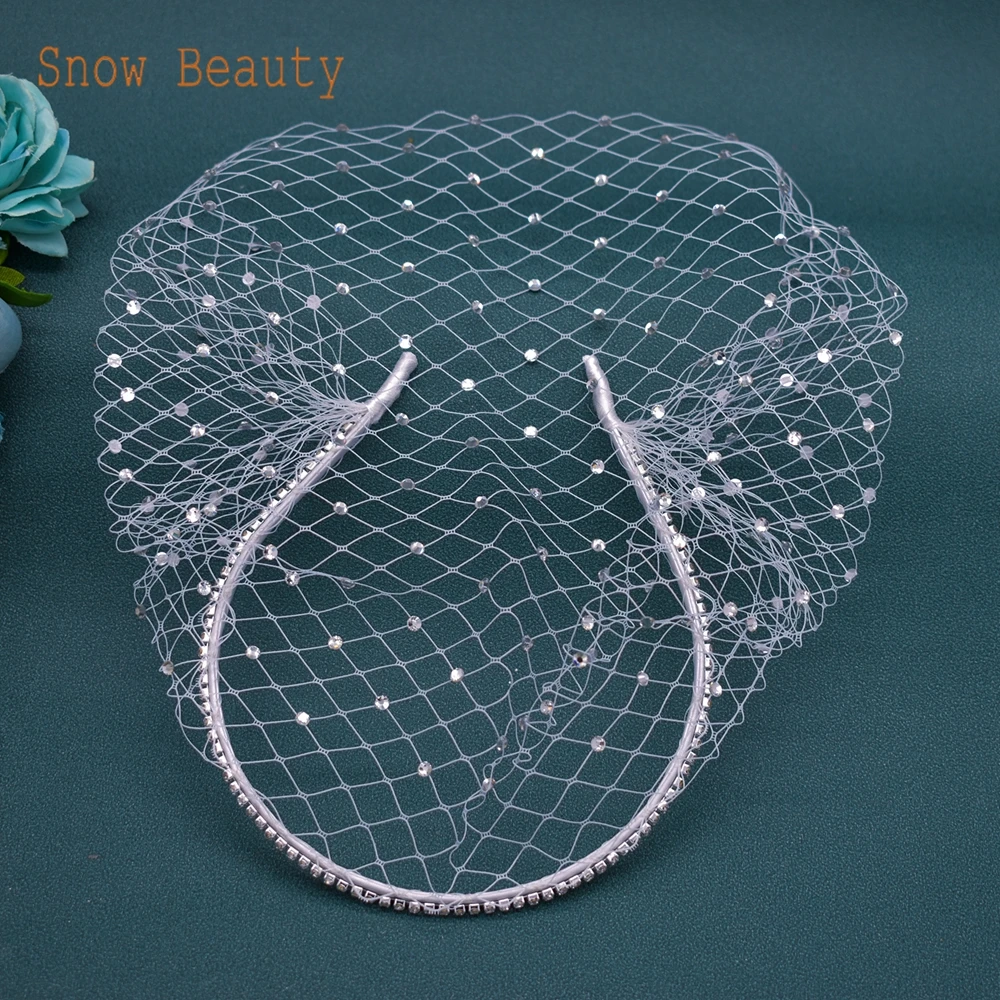 JM21 White Wedding Headband Veil Black Face Veil for Bride Charming Headwear Accessories Elegant Rhinestone Birdcage Veil