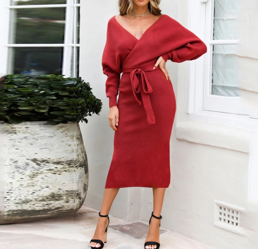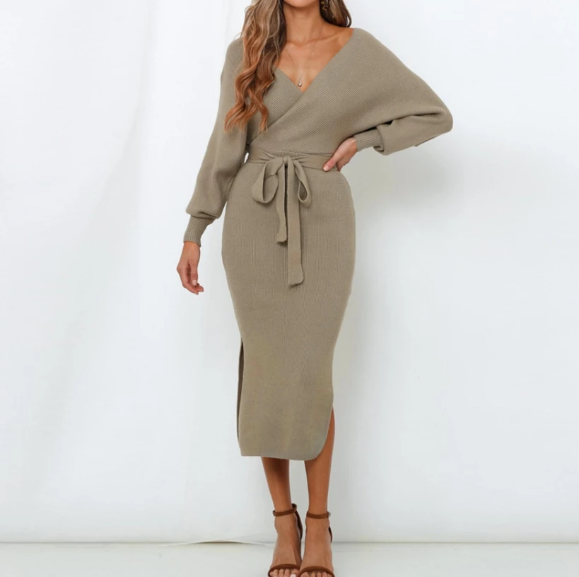 Knitted Dress Slim Fit V-Neck Woolen Women Spring Autumn Elegant Sexy Style Long Sleeves High Waist Solid Color Irregular Skirt