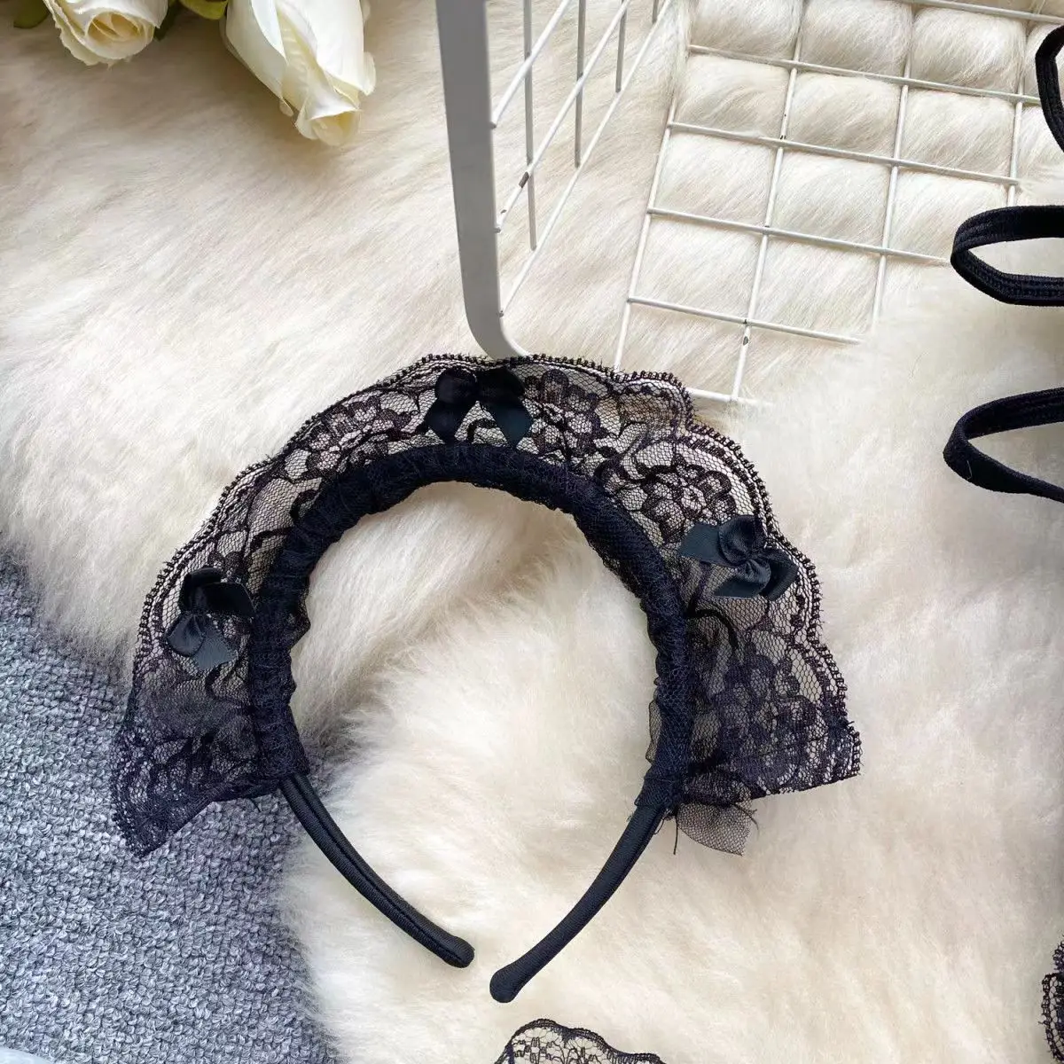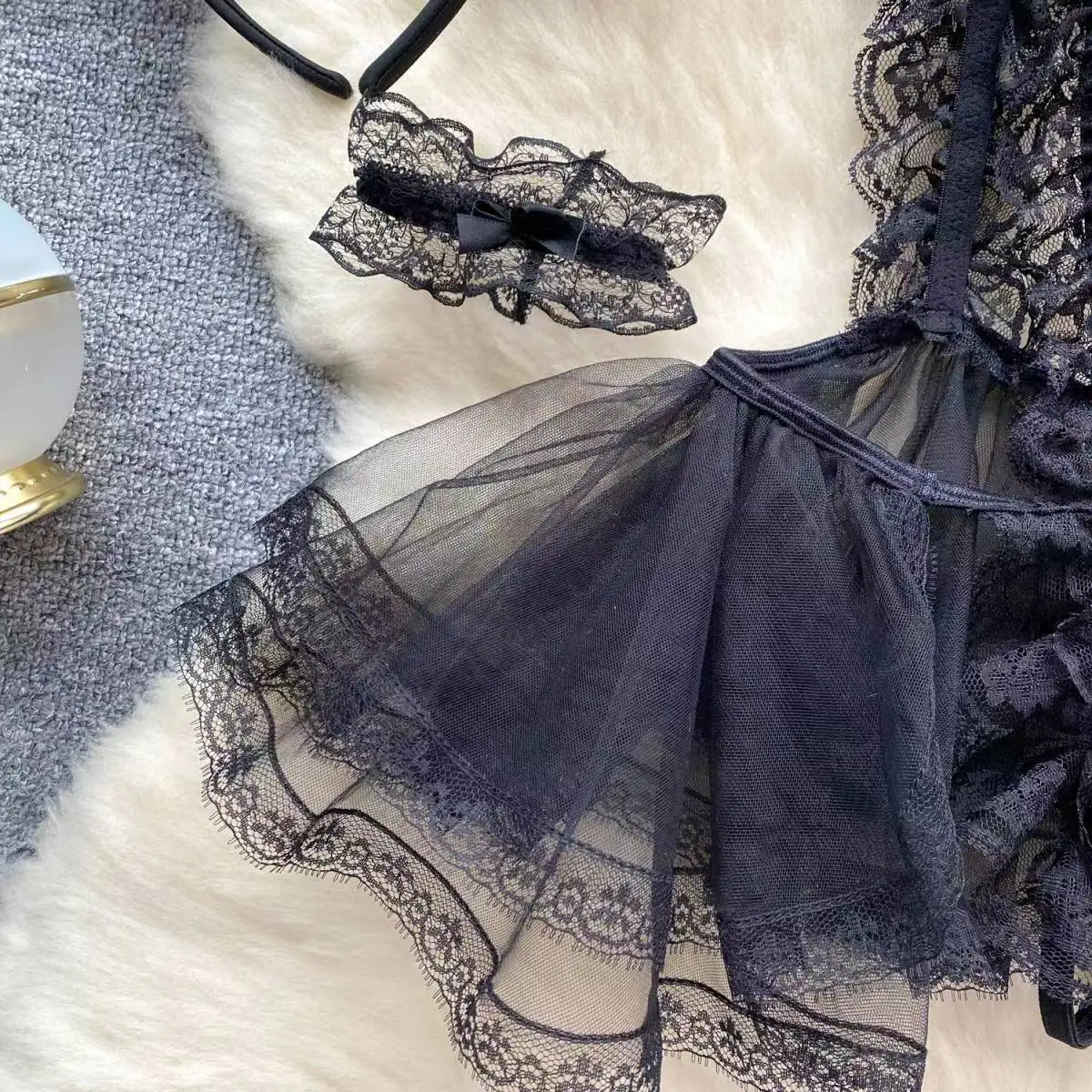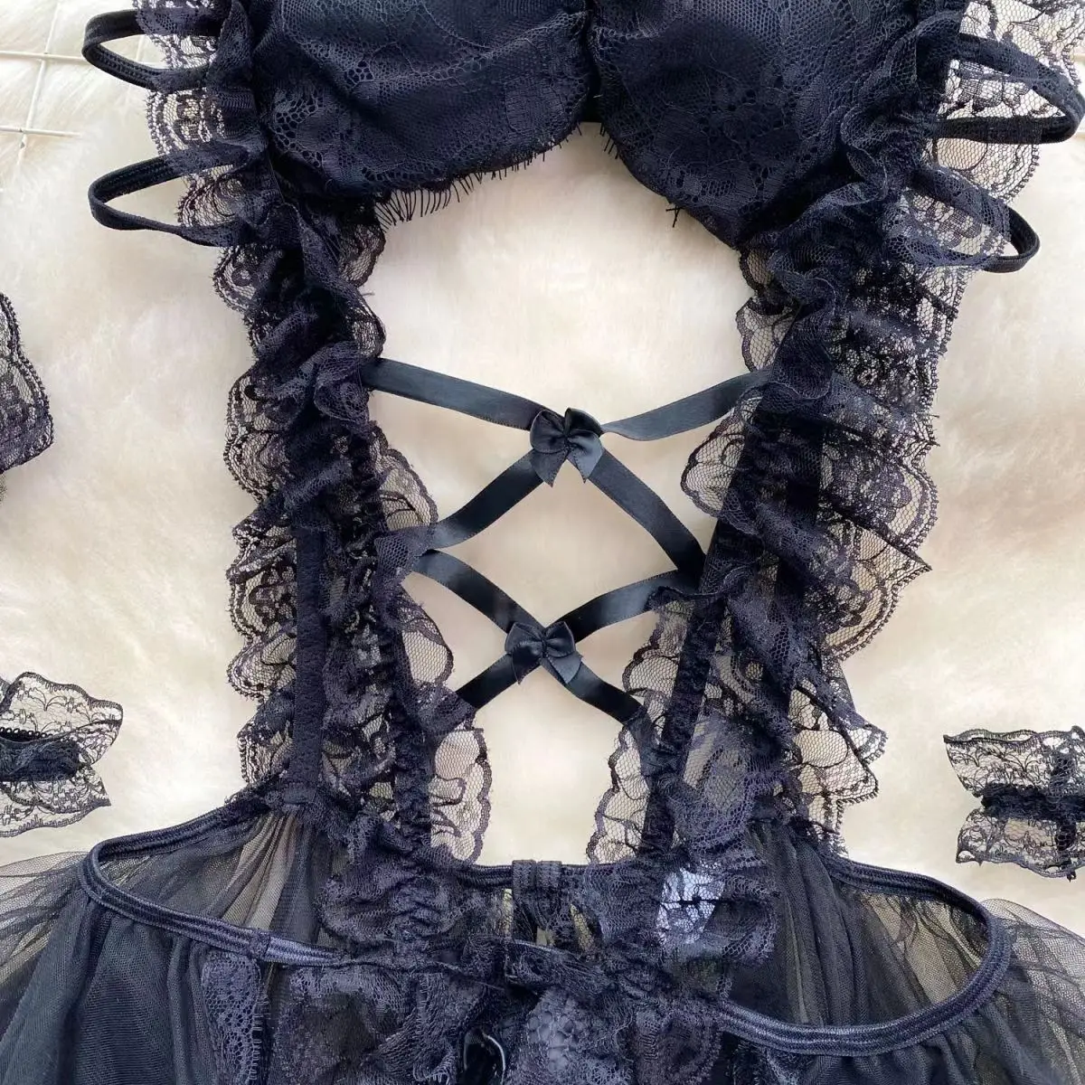 Lolita Strap Bodysuit With Cross Lace Up Hollow Patchwork Playsuit Double-Layer Sheer Mesh Sweet Women's Pajamas Sexy Lingerie