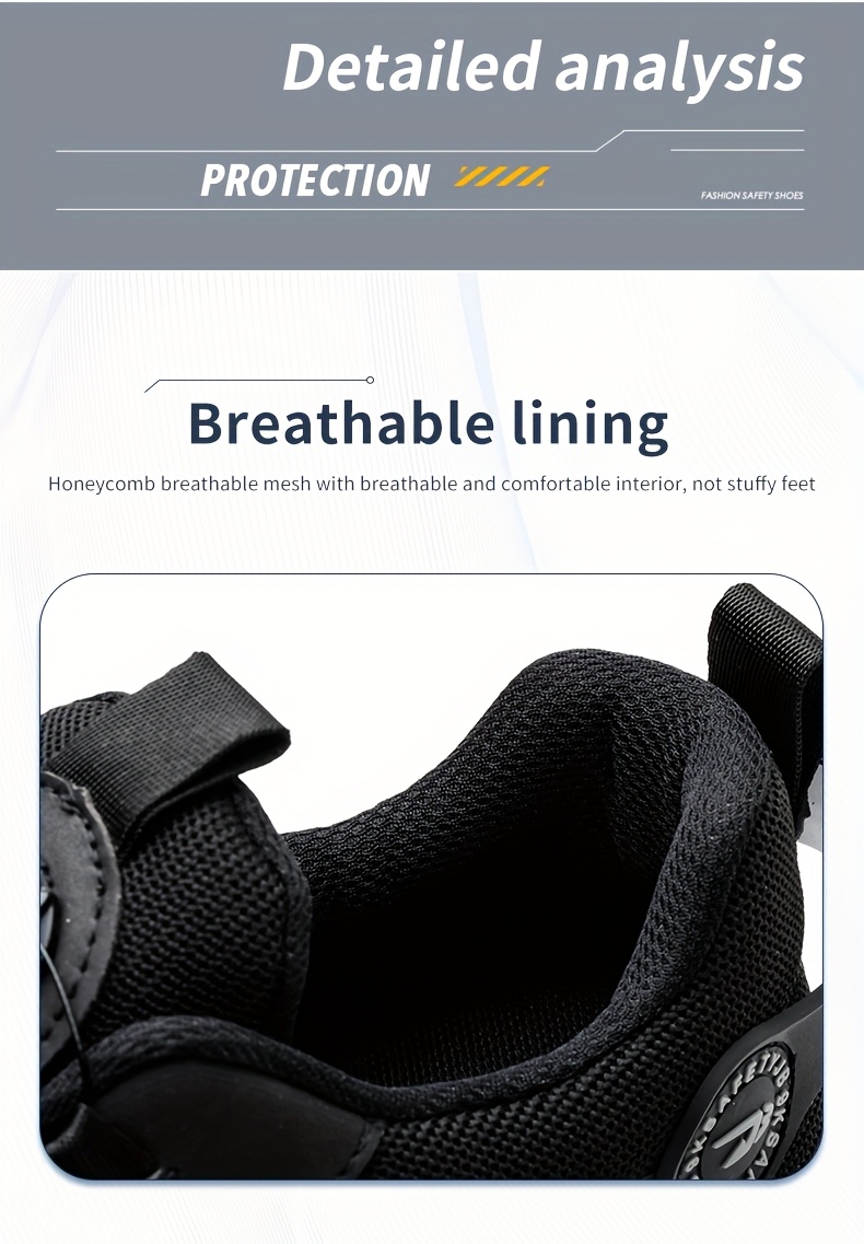 Step up your work game with our Men's Breathable Safety Shoes featuring anti-crush and puncture-proof technology. Designed for comfort and versatility, these shoes excel in industrial and outdoor environments. Why you'll love it: - Premium Breathable Fabric for All-Day Comfort. - Anti-Crush and Puncture-Proof Protection. - Convenient Elastic Band and Rotary Closure Design. - Ideal for All Seasons and Casual Activities. - Universally Stylish for Any Occasion. Crafted with a high-quality breathable upper fabric and durable PU sole, these low-top shoes provide exceptional support and safety. They're not just functional; they also promise a relaxed fit for everyday wear, making them the perfect choice for work or play. Slip into these shoes effortlessly using the elastic closure and rotary button for a secure fit on the go. Whether you're in a warehouse or enjoying casual outings, these safety shoes are designed to keep your feet protected and comfortable. Don't miss out on this best seller—grab your pair today!