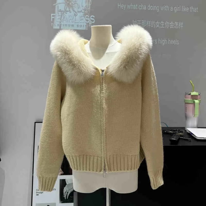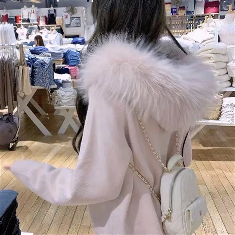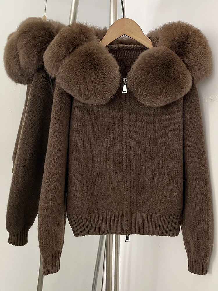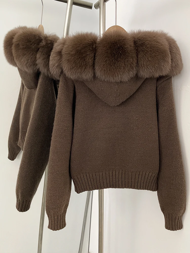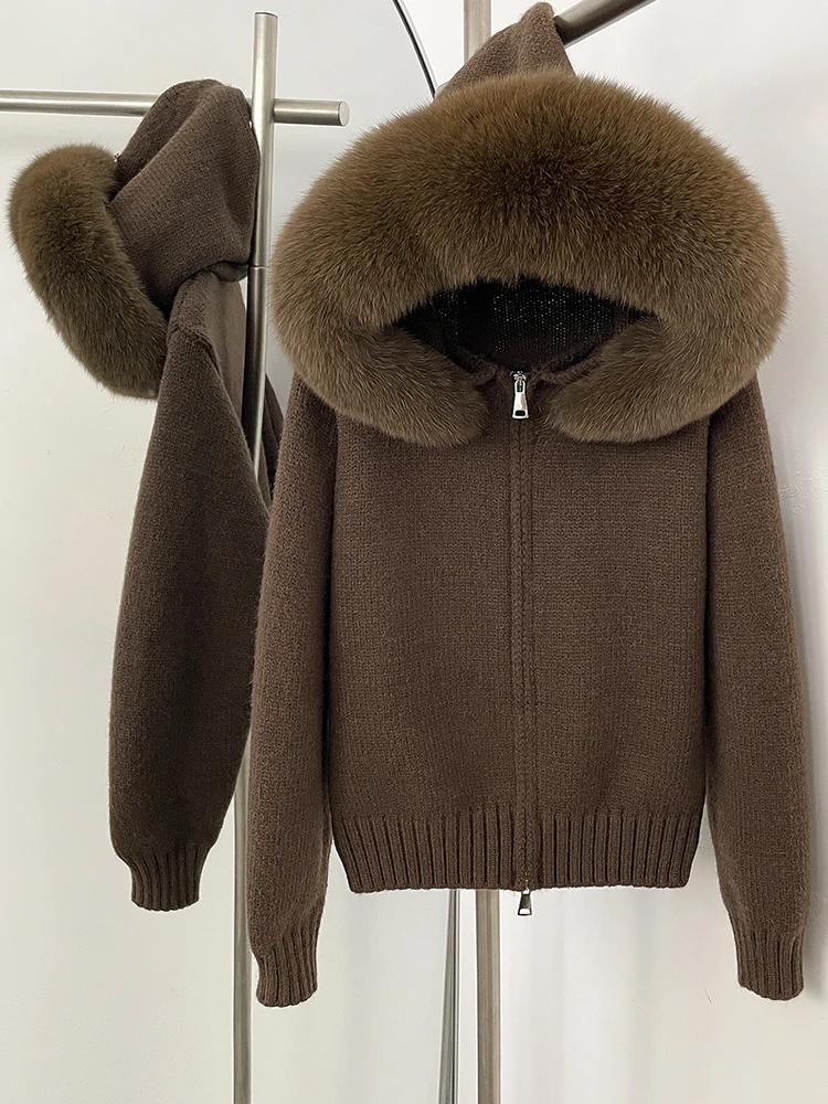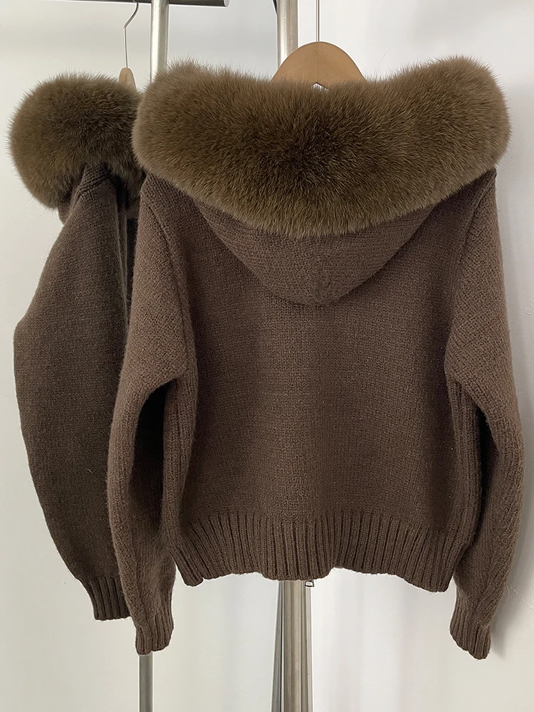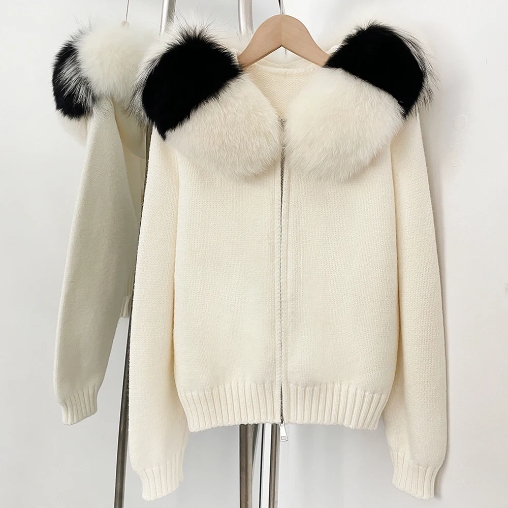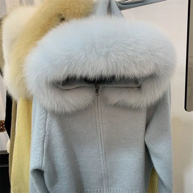 OFTBUY New Fashion Autumn Winter Casual Hooded Real Fox Fur Collar Fashion Short Knitted Jacket with Natural Fur Coat for Women
