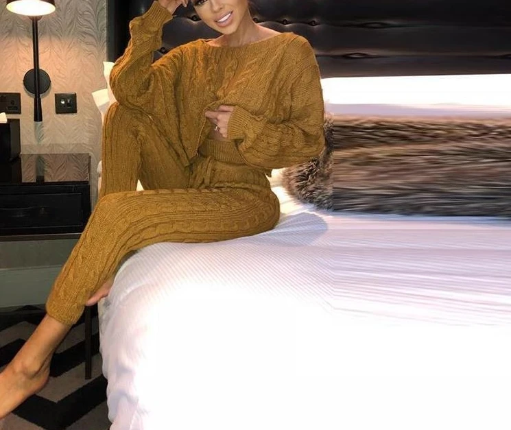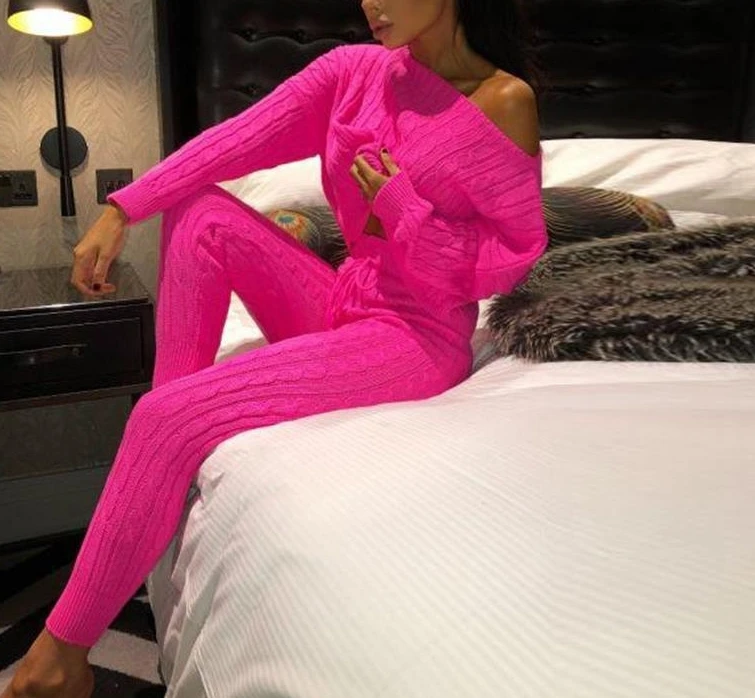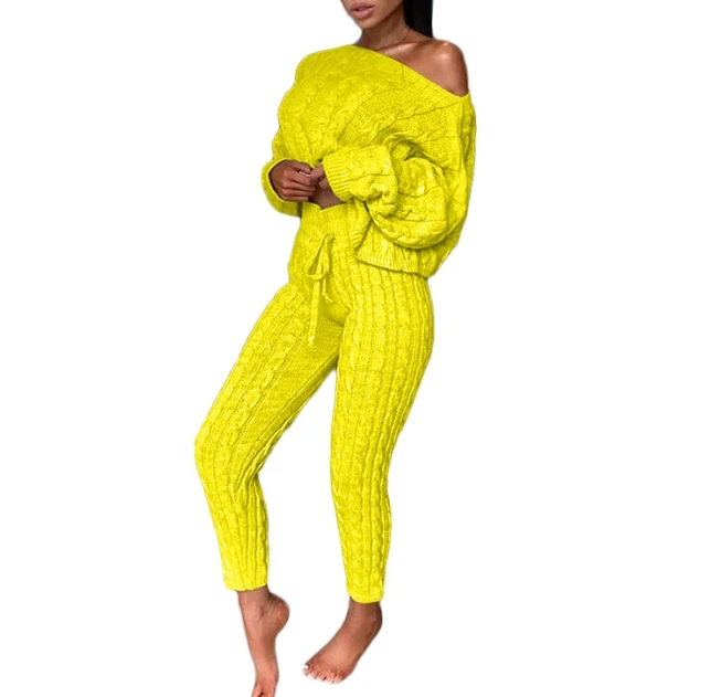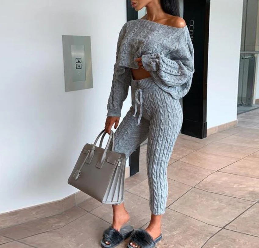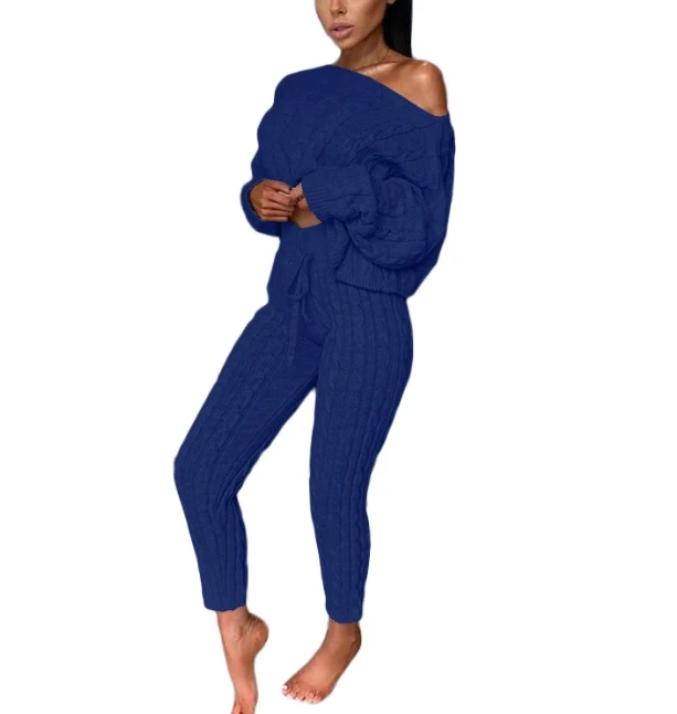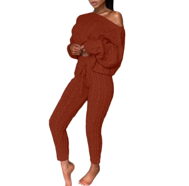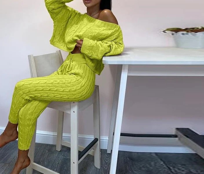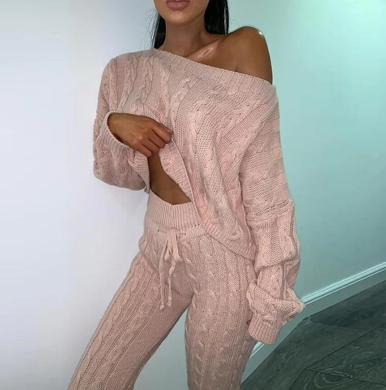Plus Size Two Piece Set Women Outfits Crewneck Knitted One Shoulder Long Sleeve Pullover Sweater High Waist Thick Pencil Pants