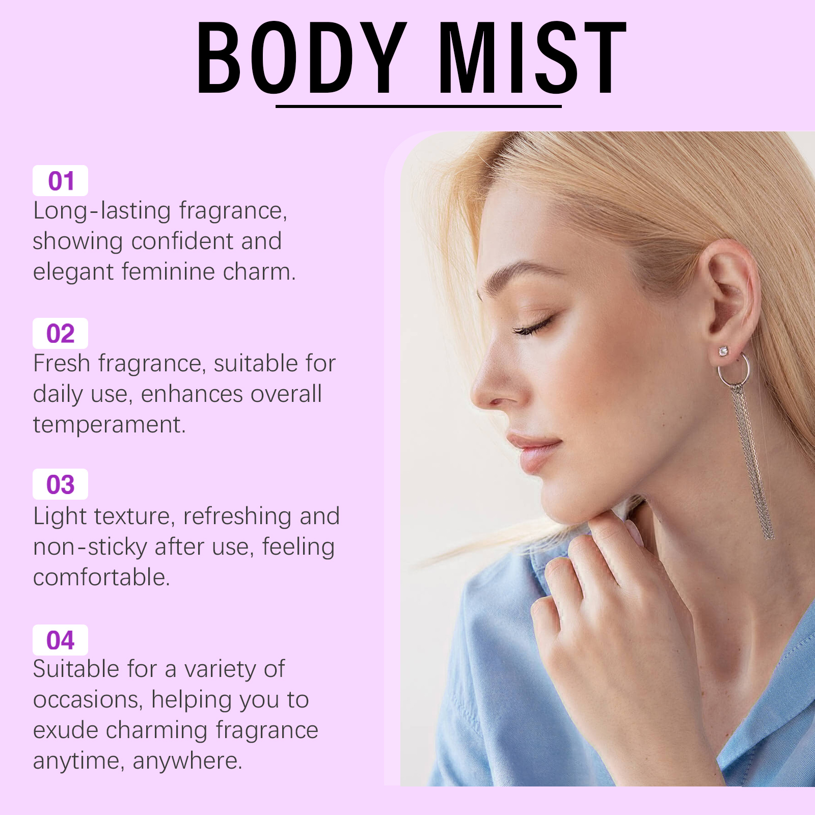 Our body perfume spray contains citrus fruit extract, cedar wood oil, glycerin. It can be subtle fragrance. Long-lasting fragrance, always exudes confidence and charm; Improve your temperament and confidence. How to use it is very simple: 1. Open the bottle cap. 2. Press the nozzle and spray the perfume on your neck, wrists or other parts of your body. Subtle fragrance, elegant experience, suitable for all occasions. Daily use, continuous fragrance, improve the quality of life.