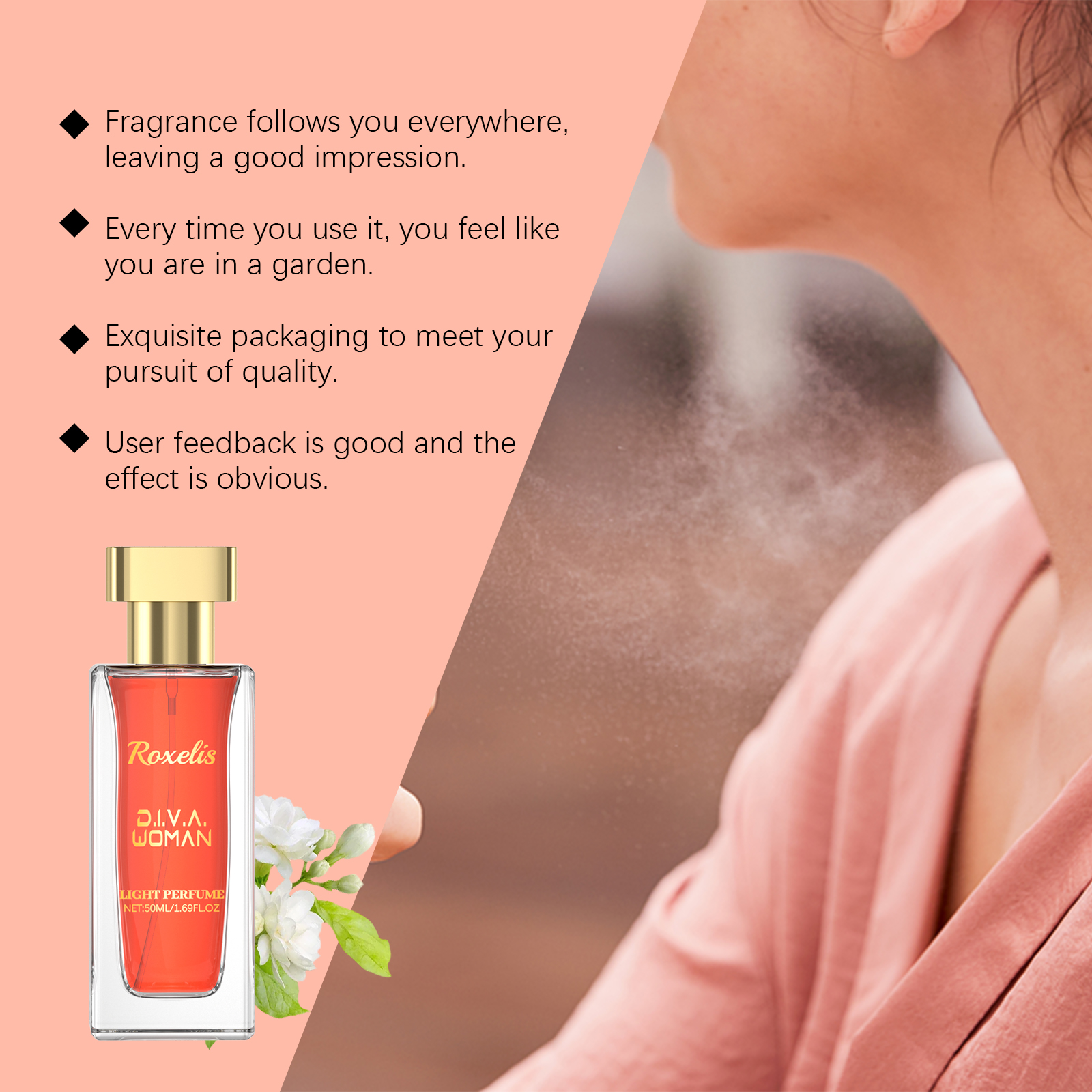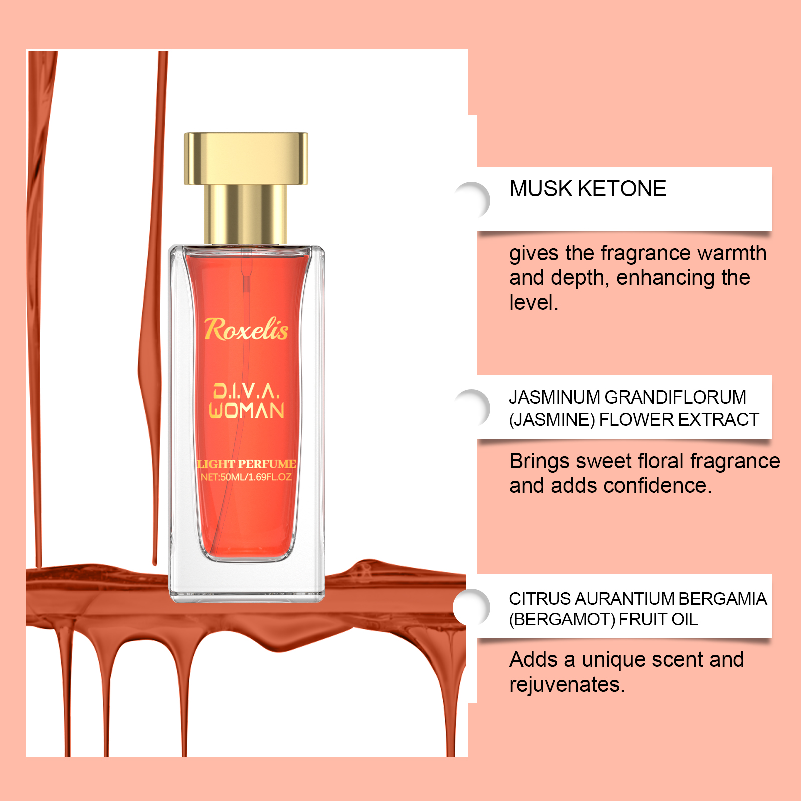 Our Red Jasmine fragrance contains musk, jasmine flower extract and neroli oil. It can be based on elegant incense, light and long-lasting, bringing a long-lasting fresh atmosphere. Suitable for all occasions, enhance your temperament. The way to use it is simple: take the right amount of this product and spray it evenly behind the ears on the wrist, neck and other areas where you want to leave fragrance, or spray the perfume in the air so that the perfume is evenly dispersed throughout the body, leaving a fragrant aroma. And lime bergamot (bergamot) fruit oil can bring freshness.