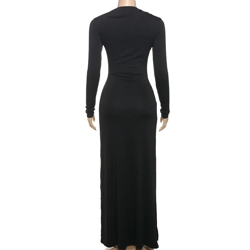 Sibybo Elegant Draped Ruched Maxi Dress Women Autumn O Neck Long Sleeve Bandage Slim Bodycon Robes Sexy Evening Party Dresses