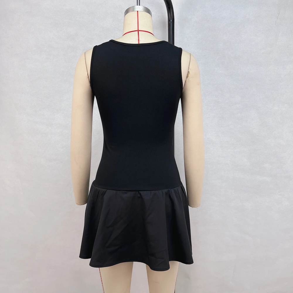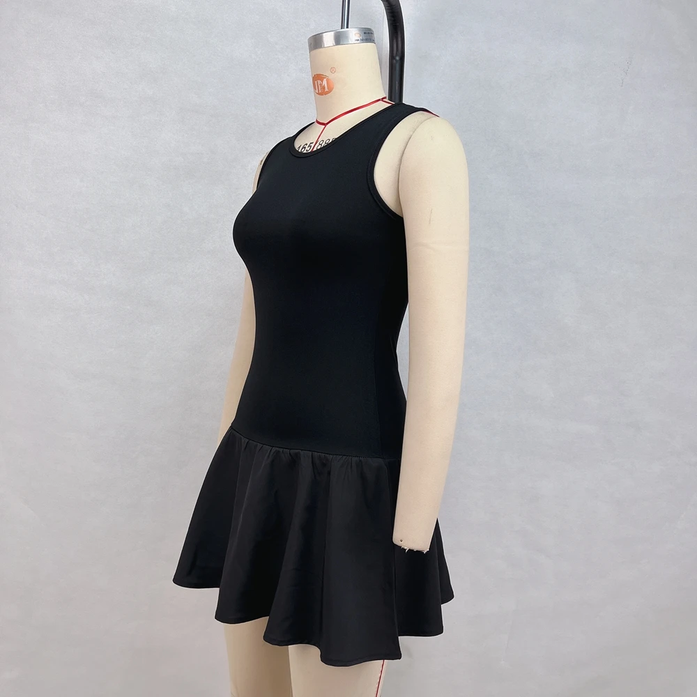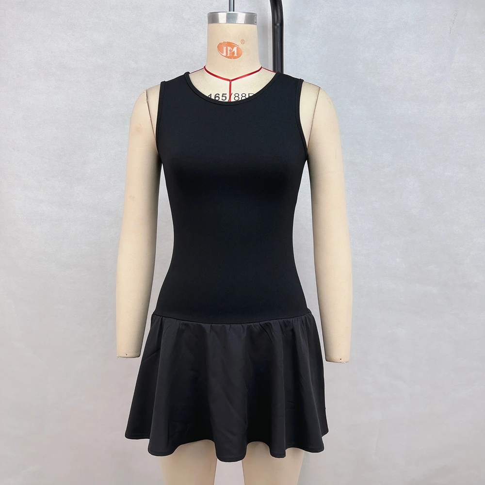 Summer New Fashionable Solid Color Round Neck Sleeveless Patchwork Pleated Short Sexy Dress For Women