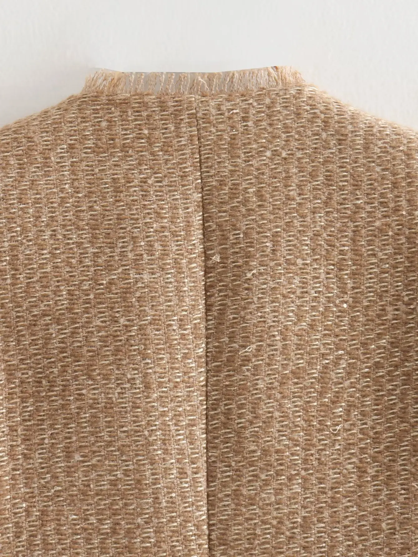Elevate your style with this Elegant Women's Tweed Short Jacket featuring Long Sleeves and a Camel color. Made for the fashion forward woman, this Frayed Cropped Jacket is a must-have in every wardrobe.
