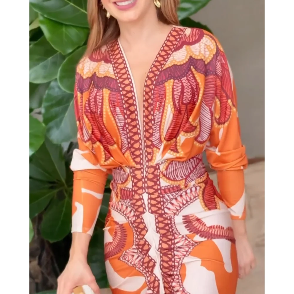 Vintage Baroque Long Sleeve Bodycon Dress Casual Plunge V Neck Slim Fit Midi Dress
