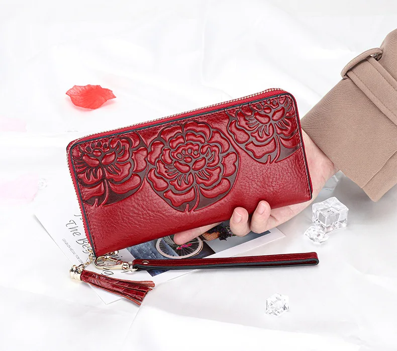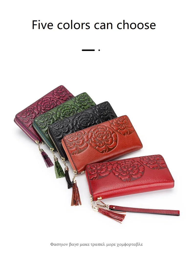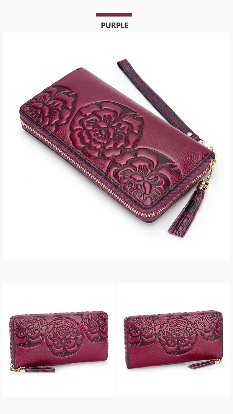 Vintage Real Cow Leather Purse Women 3D Floral Ladies Wallet Genuine Leather Clutch Bag