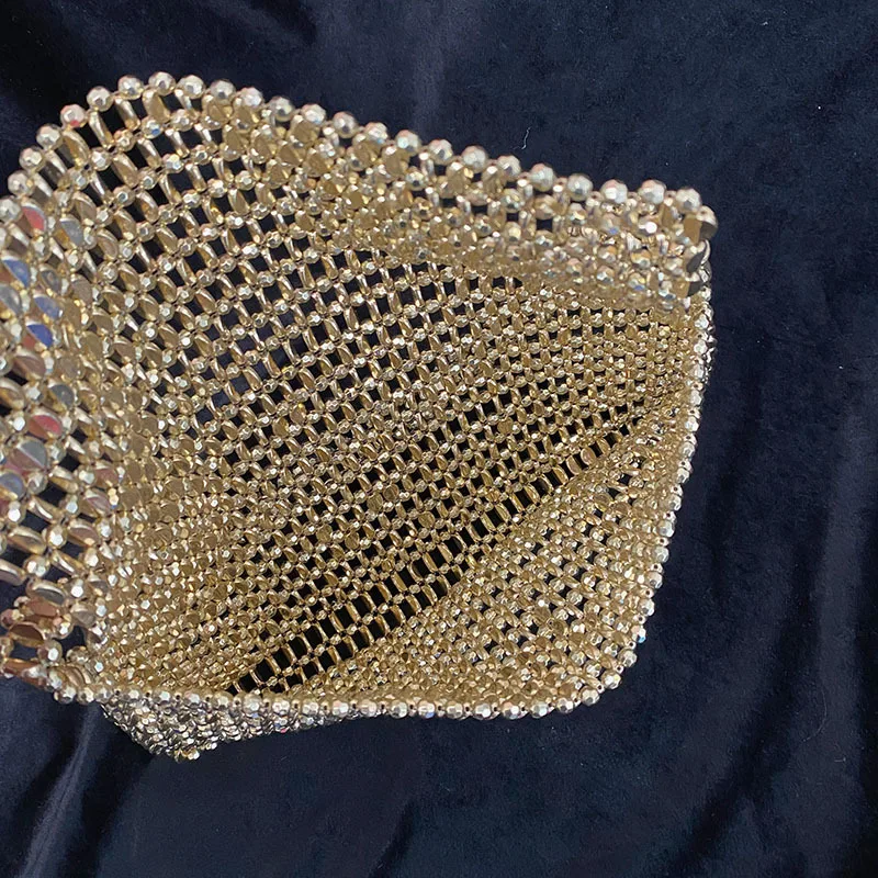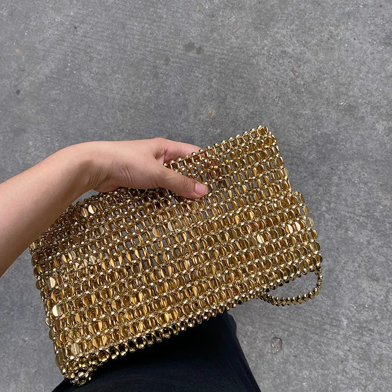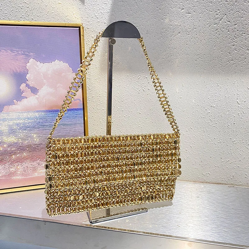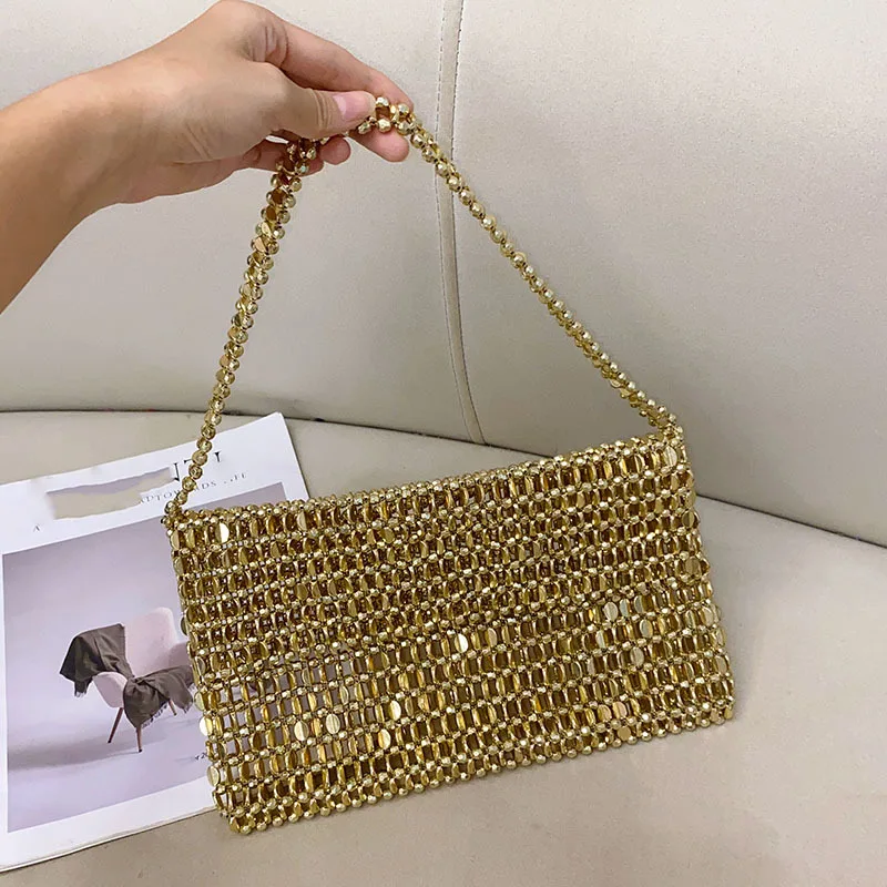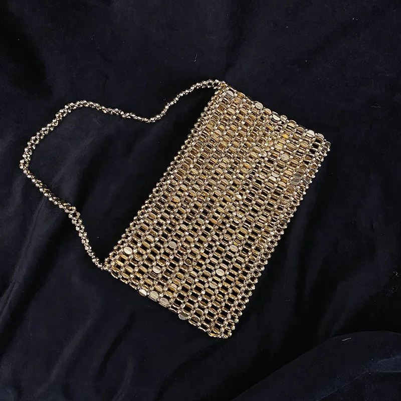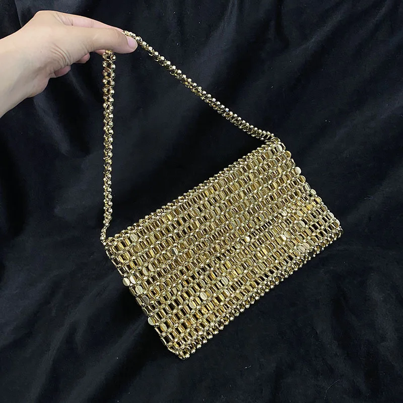 Vintage Shiny Metal Hand Woven String Pearl Flip Hollow Large Capacity Tote Banquet Underarm Clutch