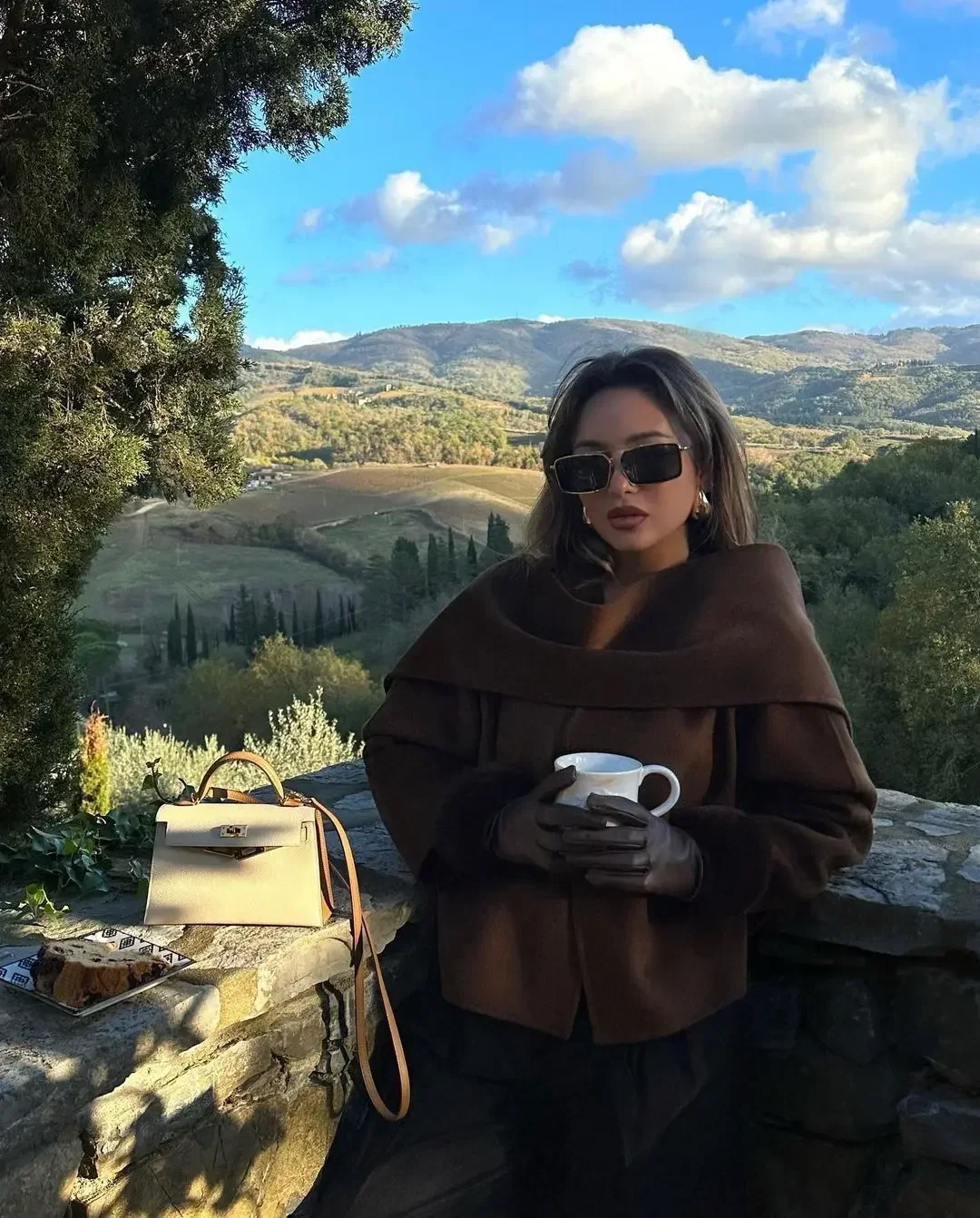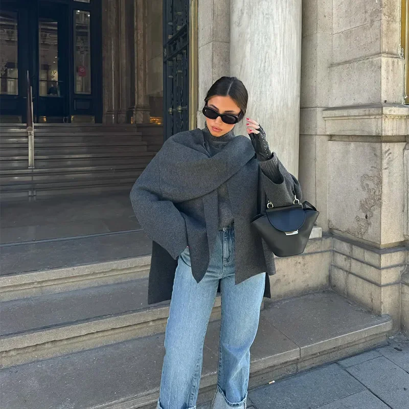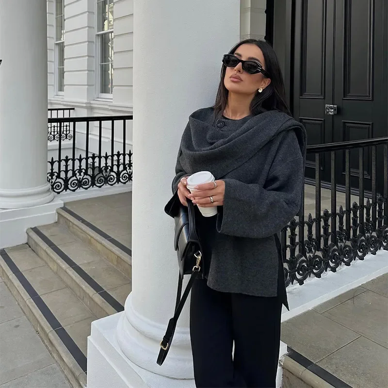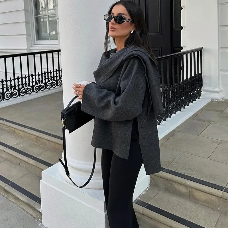 Women Brown Scarf Shawl Collar Short Wool Blends Coat Elegant Fashion Long Sleeve Casual Jacket 2024 Autumn New Street Outerwear