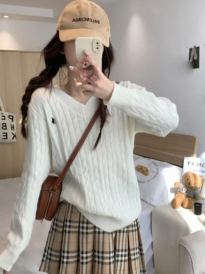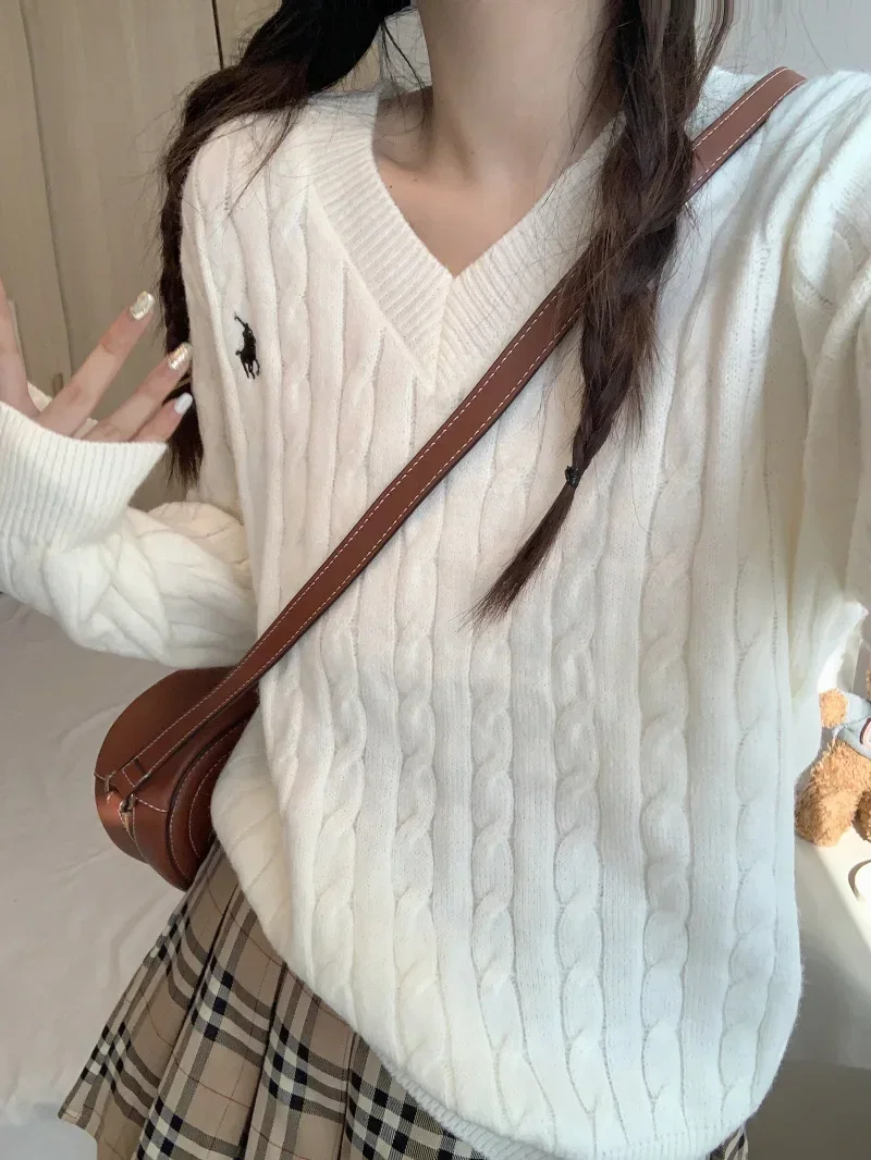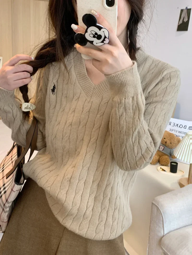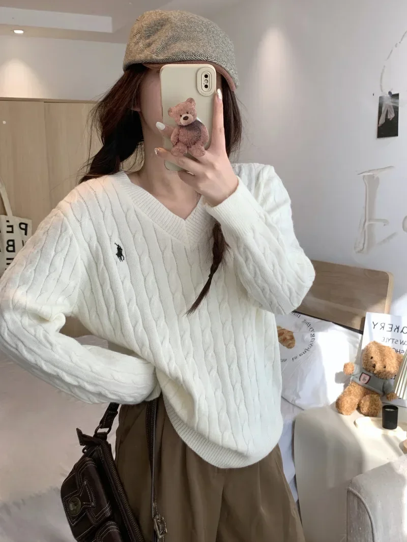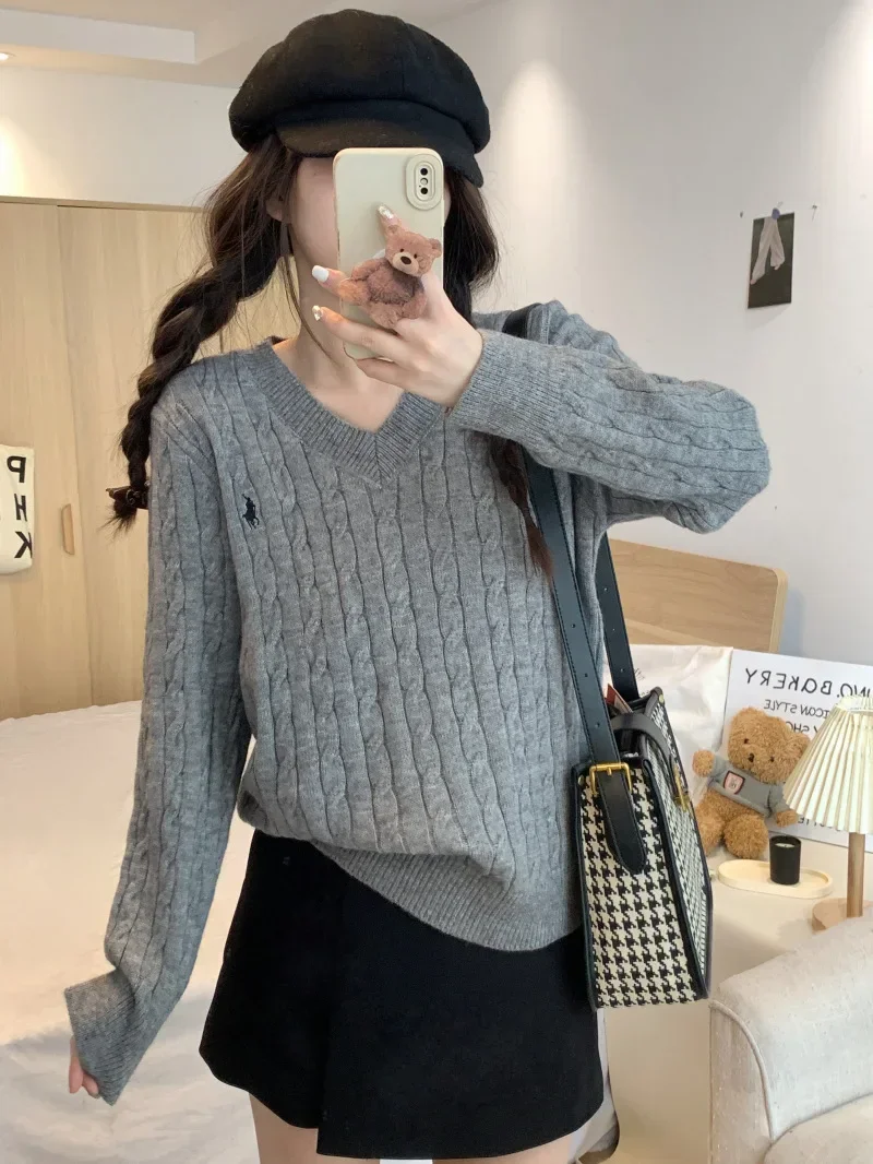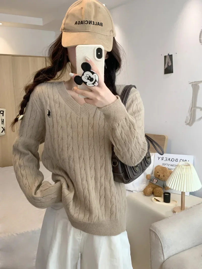 Women's Loose Long Sleeve Knitted Sweater Autumn Winter Inner Wear V-Neck Embroidered Pattern Tassel Twist Korean Style Top