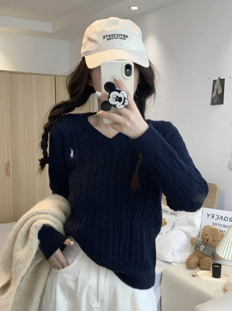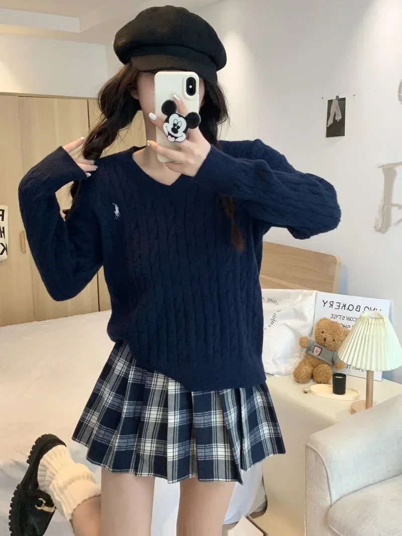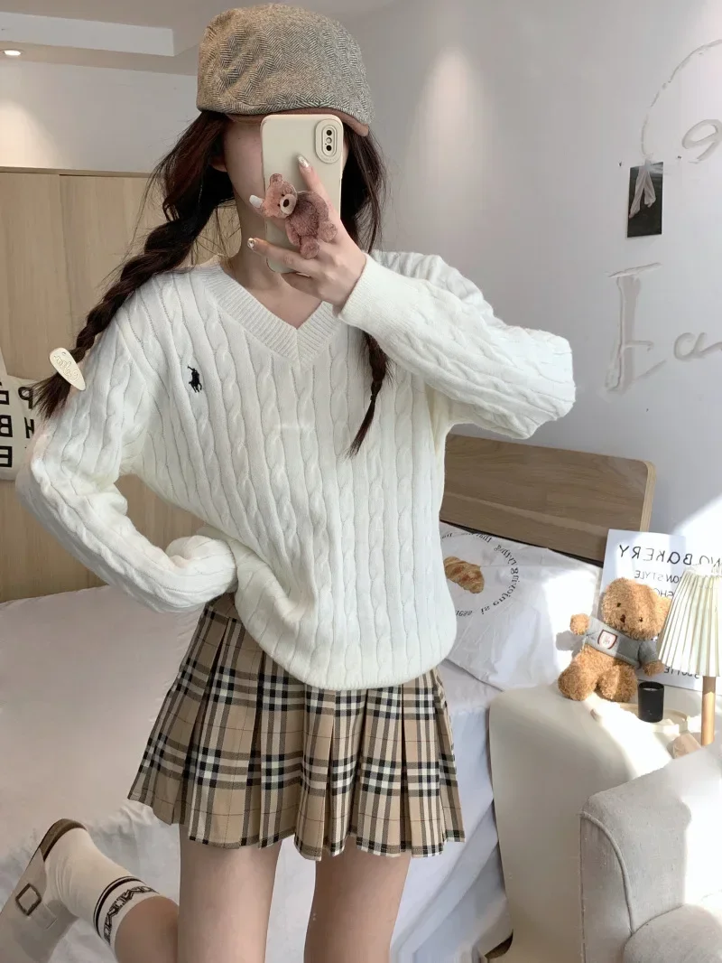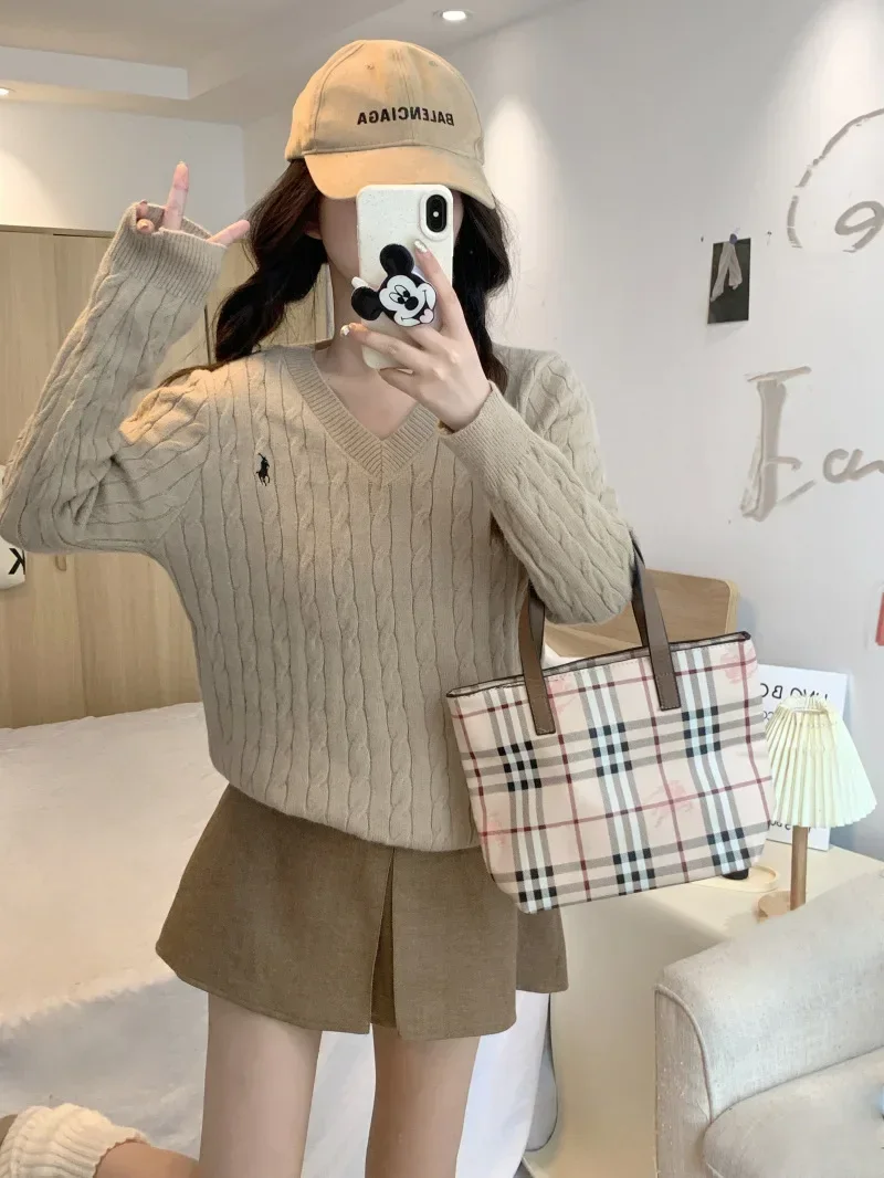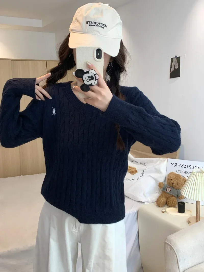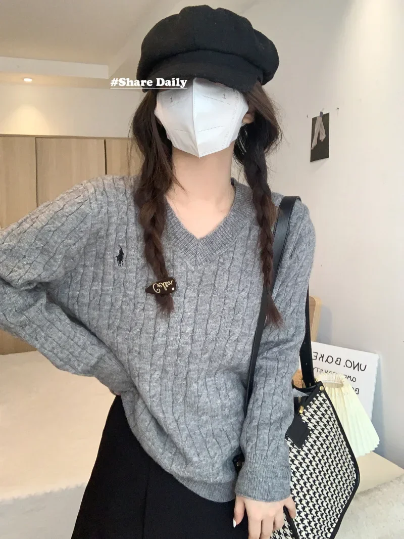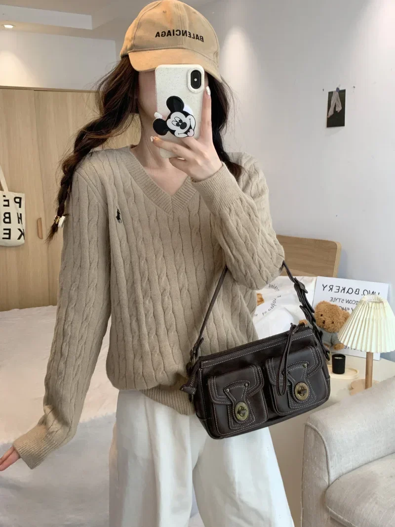 Women's Loose Long Sleeve Knitted Sweater Autumn Winter Inner Wear V-Neck Embroidered Pattern Tassel Twist Korean Style Top