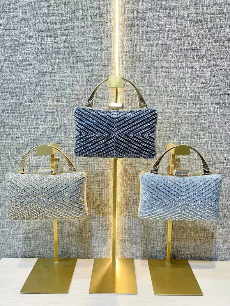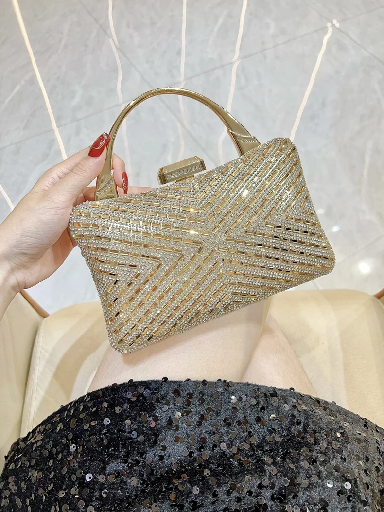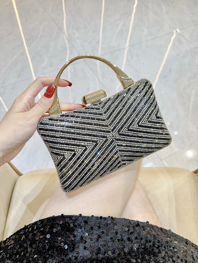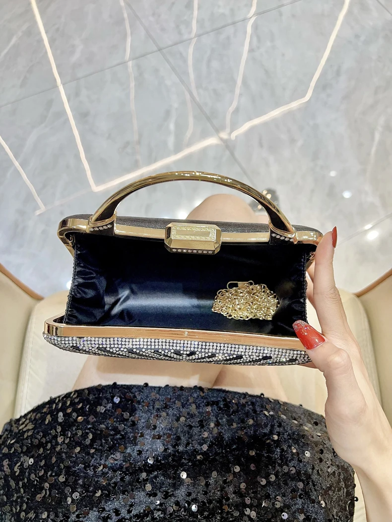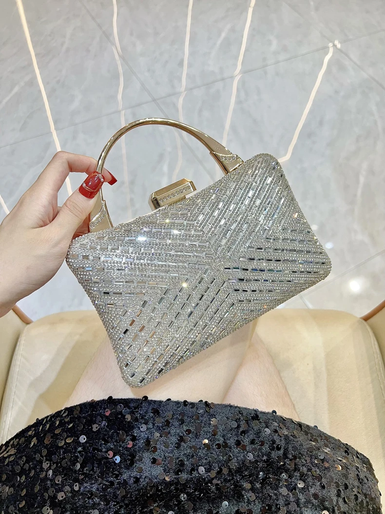 Women's Metal Handle Shiny Diamonds Evening Stylish Elegant Rhinestone Chain Shoulder Bags Wedding Bride Dinner Party Clutch Bag