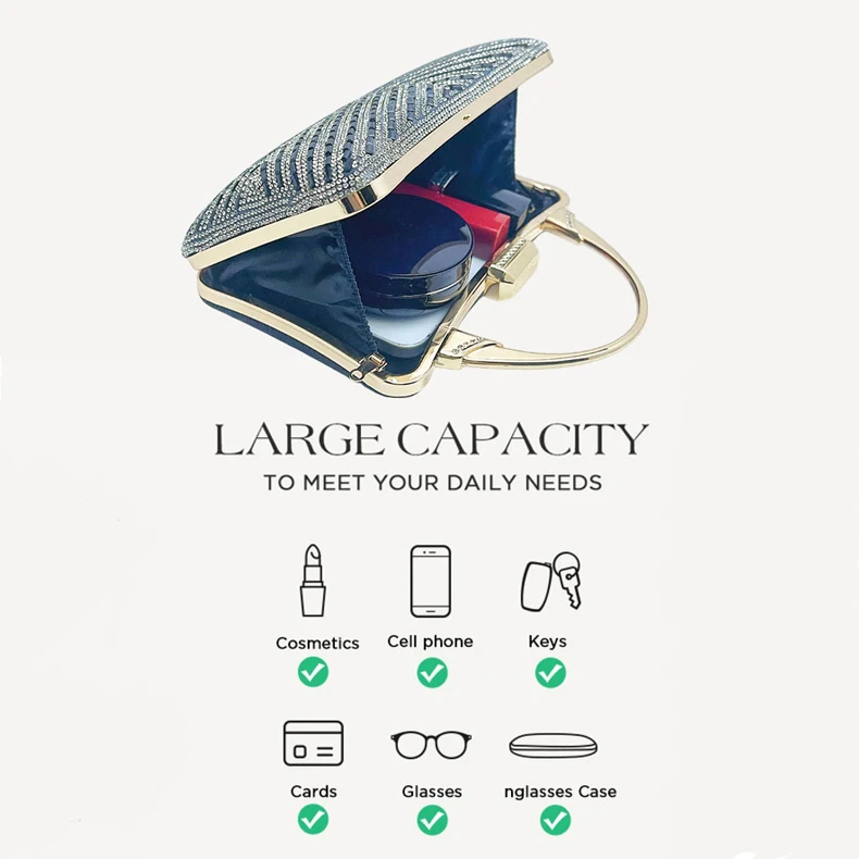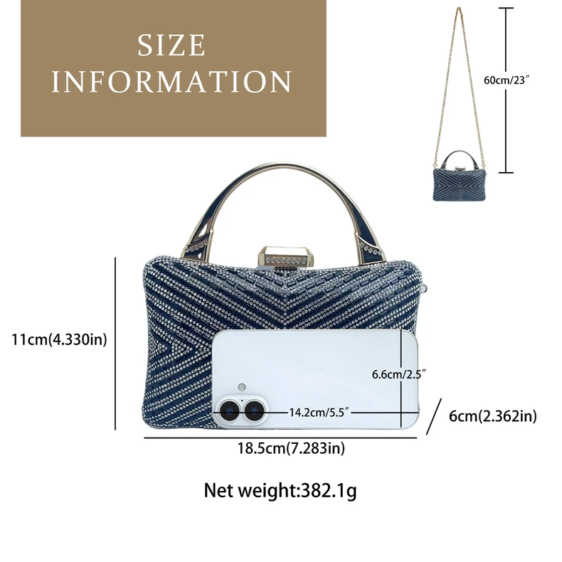 2.Product details: diamond-studded portable, detacheable chain, metal handles, easy opening design