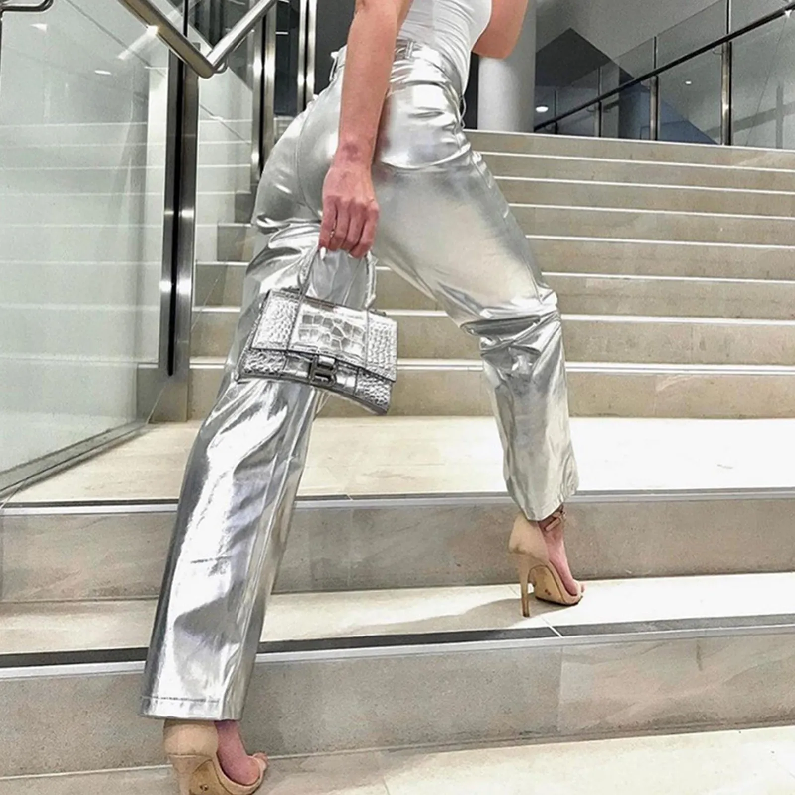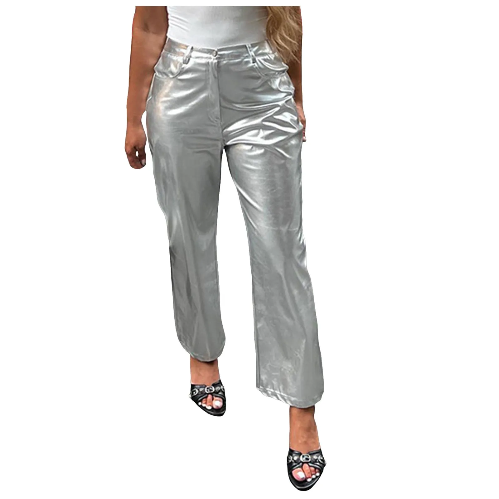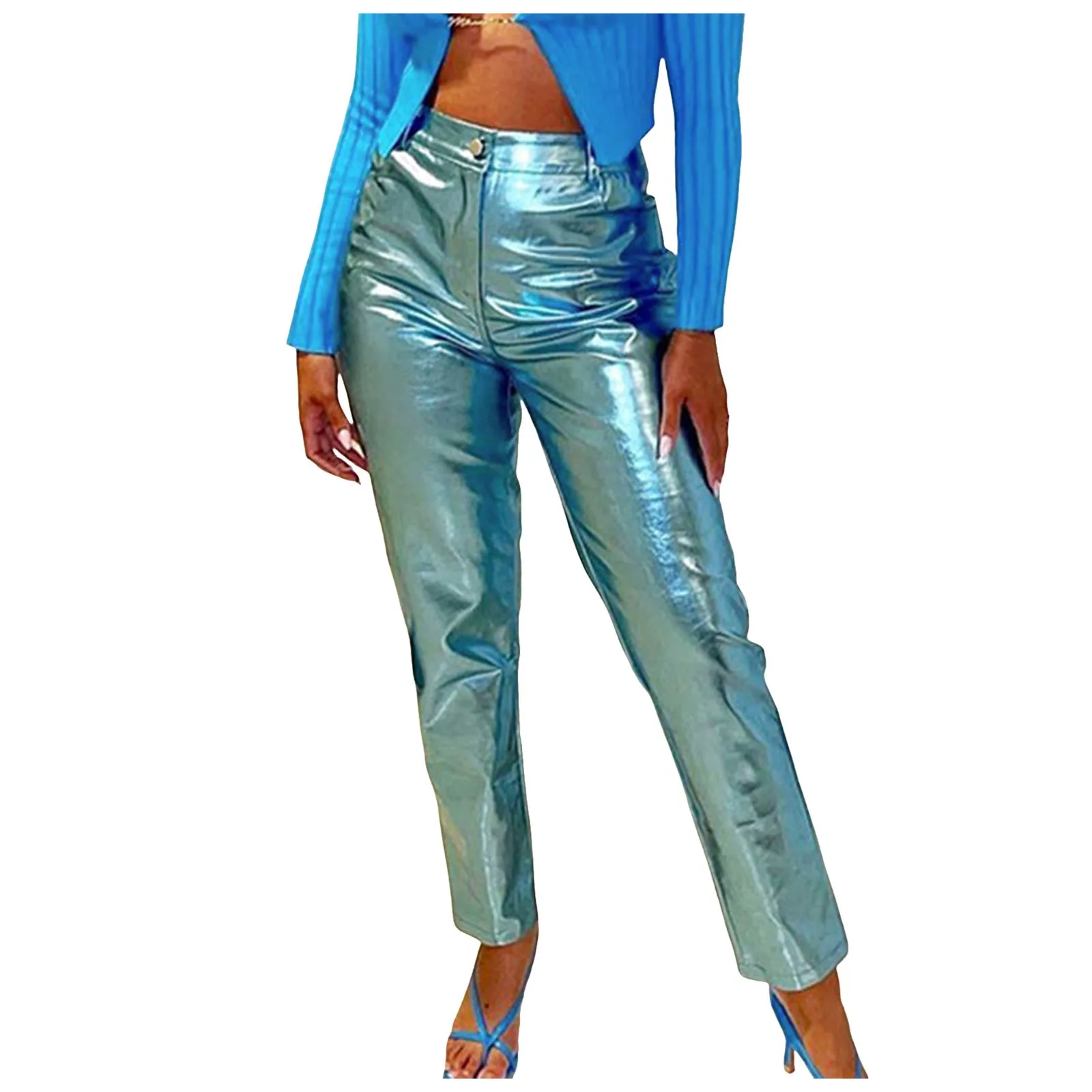 Women'S Metallic Green Straight Leg Pants Fashion Pocket High Waist Shiny Fabric Pu Leather Pants Street Style Trousers