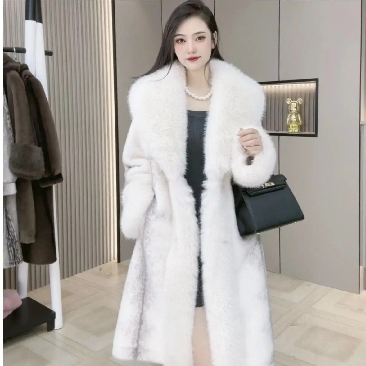 Women's Winter Mink Fur Overcoat, Fox Fur Collar, Long Loose Fur Jacket, Female Thicken Warm Parker Coat, New, 2023